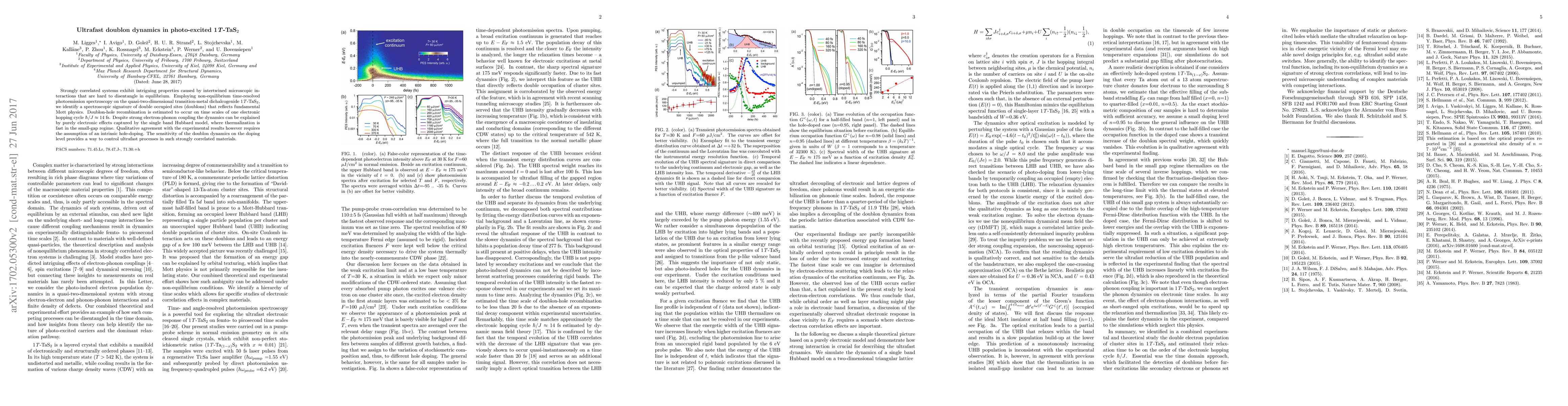 This study uses non-equilibrium time-resolved photoemission spectroscopy to investigate the ultrafast dynamics of doublons in photo-excited 1T-TaS$_2$, revealing that doublon-hole recombination occurs on femtosecond timescales, primarily driven by electronic effects despite strong electron-phonon coupling. The findings suggest that doping level sensitivity can control ultrafast processes in strongly correlated materials.