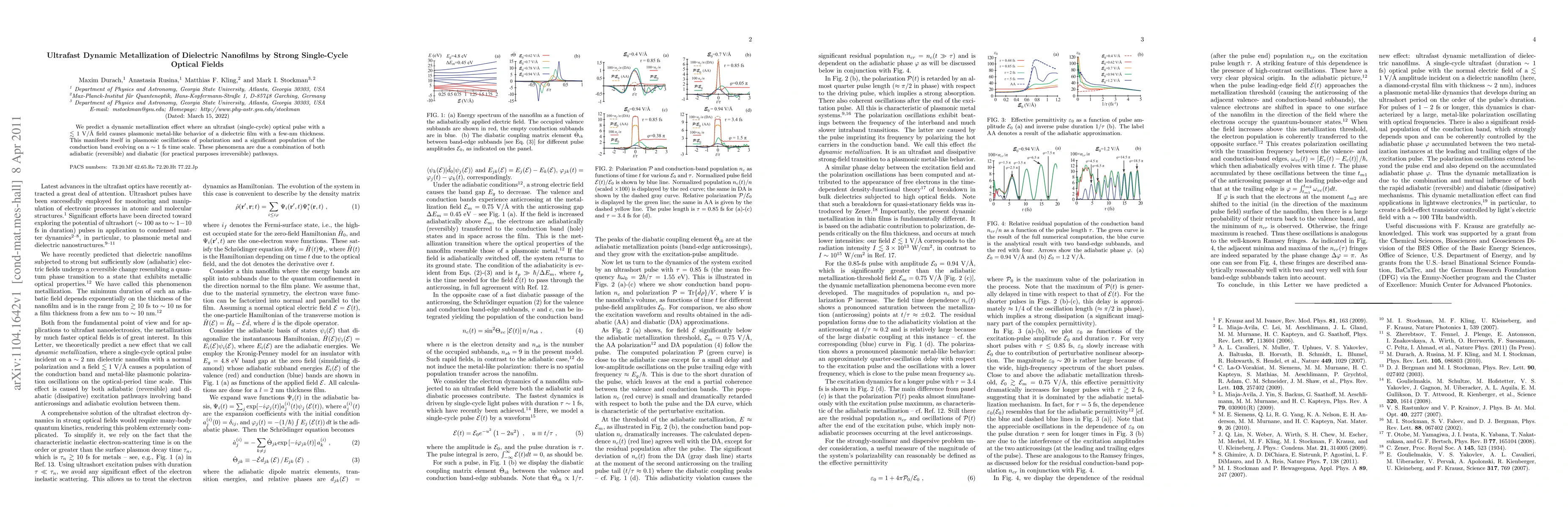 Summary: An ultrafast single-cycle optical pulse induces dynamic metallization in thin dielectric nanofilms, leading to plasmonic metal-like behavior and rapid conduction band population changes on a femtosecond timescale through both reversible and irreversible processes.