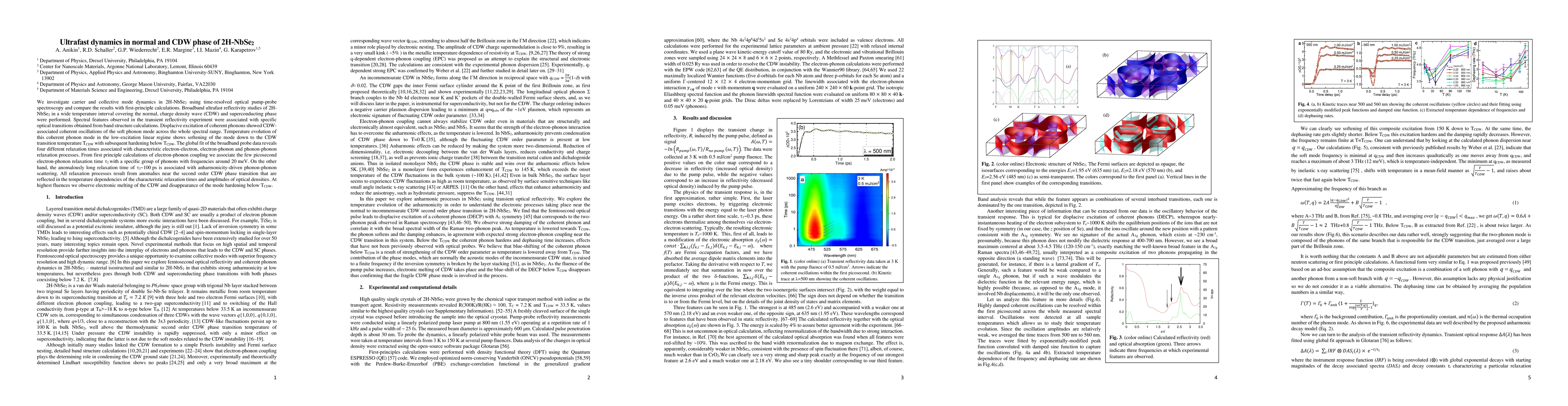 We investigate carrier and collective mode dynamics in 2H-NbSe$_2$ using time-resolved optical pump-probe spectroscopy and compare the results with first-principle calculations. Broadband ultrafast reflectivity studies of 2H-NbSe$_2$ in a wide temperature interval covering the normal, charge density wave (CDW) and superconducting phase were performed. Spectral features observed in the transient reflectivity experiment were associated with specific optical transitions obtained from band structure calculations. Displacive excitation of coherent phonons showed CDW-associated coherent oscillations of the soft phonon mode across the whole spectral range. Temperature evolution of this coherent phonon mode in the low-excitation linear regime shows softening of the mode down to the CDW transition temperature T$_{CDW}$ with subsequent hardening below T$_{CDW}$. The global fit of the broadband probe data reveals four different relaxation times associated with characteristic electron-electron, electron-phonon and phonon-phonon relaxation processes. From first principle calculations of electron-phonon coupling we associate the few picosecond electron-phonon relaxation time $\tau_2$ with a specific group of phonons with frequencies around 20 meV. On the other hand, the anomalously long relaxation time of $\tau_3$~100 ps is associated with anharmonicity-driven phonon-phonon scattering. All relaxation processes result from anomalies near the second order CDW phase transition that are reflected in the temperature dependencies of the characteristic relaxation times and amplitudes of optical densities. At highest fluences we observe electronic melting of the CDW and disappearance of the mode hardening below T$_{CDW}$.