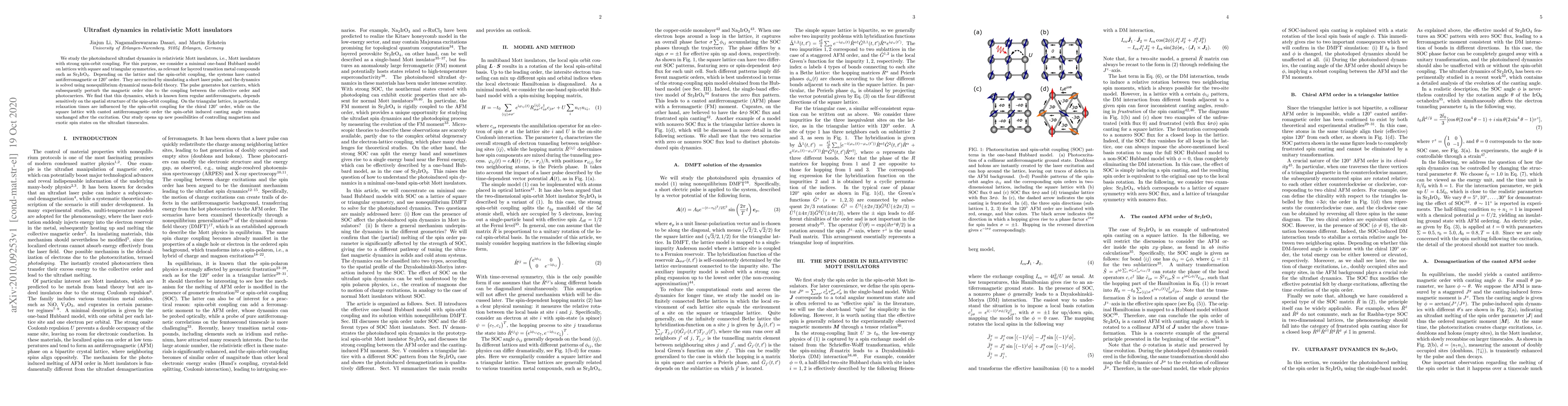 We study the photoinduced ultrafast dynamics in relativistic Mott insulators, i.e., Mott insulators with strong spin-orbit coupling. For this purpose, we consider a minimal one-band Hubbard model on lattices with square and triangular symmetries, as relevant for layered transition metal compounds such as Sr$_2$IrO$_4$. Depending on the lattice and the spin-orbit coupling, the systems have canted antiferromagnetic or $120^\circ$ order. They are excited by simulating a short laser pulse, and the dynamics is solved using nonequilibrium dynamical mean-field theory. The pulse generates hot carriers, which subsequently perturb the magnetic order due to the coupling between the collective order and photocarriers. We find that this dynamics, which is known form regular antiferromagnets, depends sensitively on the spatial structure of the spin-orbit coupling. On the triangular lattice, in particular, relaxation times are influenced by the spin-orbit coupling for the chiral $120^\circ$ order, while on the square lattice with canted antiferromagnetic order the spin-orbit induced canting angle remains unchanged after the excitation. Our study opens up new possibilities of controlling magnetism and exotic spin states on the ultrafast timescales.