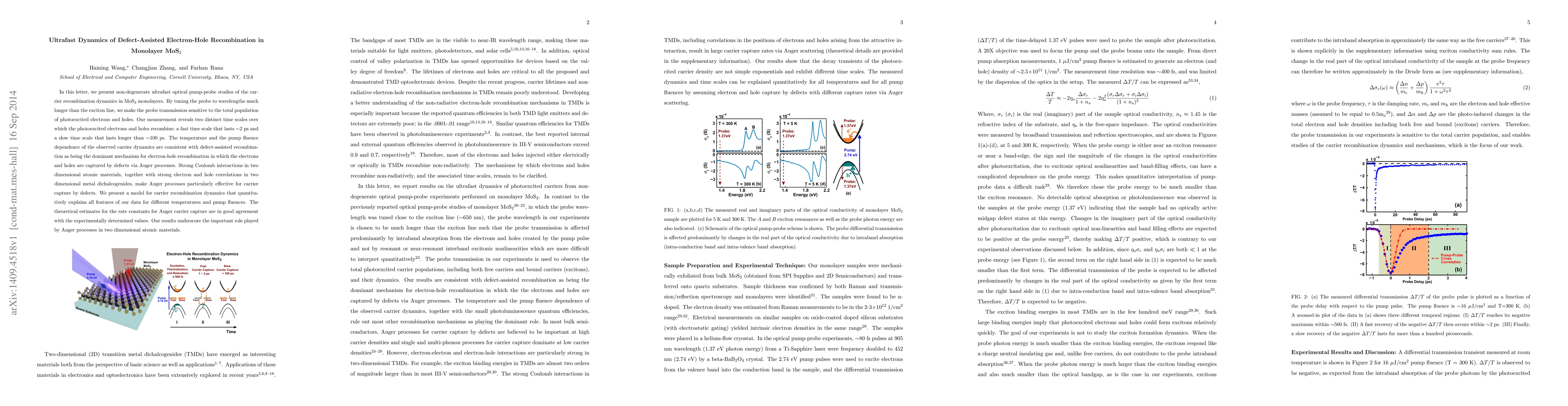 This paper investigates ultrafast electron-hole recombination in monolayer MoS$_2$ using pump-probe techniques, revealing two recombination time scales. The study attributes the dominant recombination mechanism to defect-assisted Auger processes, supported by a quantitative model that aligns well with experimental data.