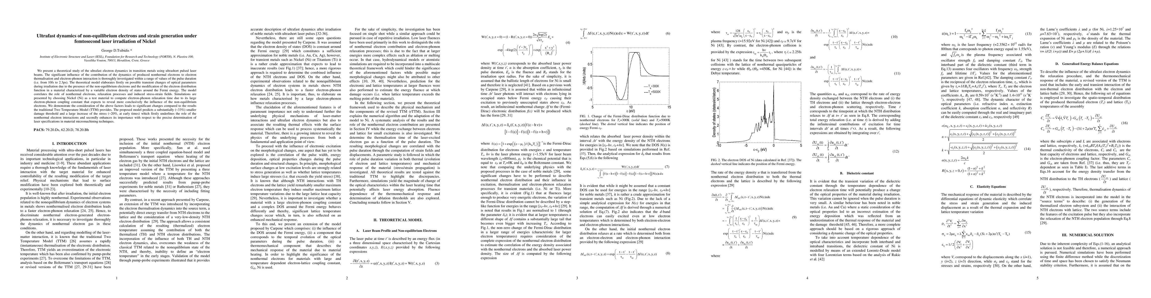 This paper investigates ultrafast electron dynamics in Nickel under femtosecond laser irradiation, emphasizing the role of non-equilibrium electrons in electron thermalization and electron-phonon interactions. The study reveals significant changes in stress-strain fields and a substantially lower damage threshold compared to traditional models, highlighting the importance of nonthermal electron interactions in material micromachining.