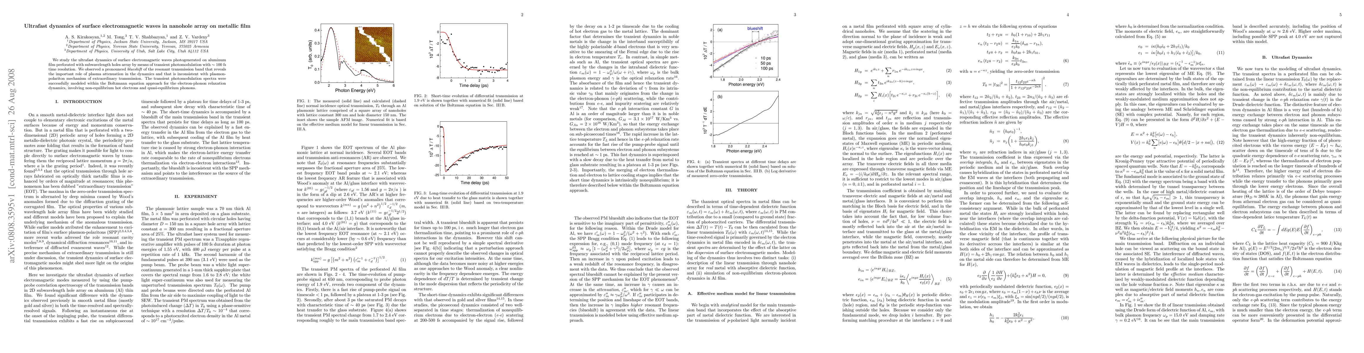 We study the ultrafast dynamics of surface electromagnetic waves photogenerated on aluminum film perforated with subwavelength holes array by means of transient photomodulation with 100 fs time resolution. We observed a pronounced blueshift of the resonant transmission band that reveals the important role of plasma attenuation in the dynamics and that is inconsistent with plasmon-polariton mechanism of extraordinary transmission. The transient photomodulation spectra were successfully modeled within the Boltzmann equation approach for the electron-phonon relaxation dynamics, involving non-equilibrium hot electrons and quasi-equilibrium phonons.