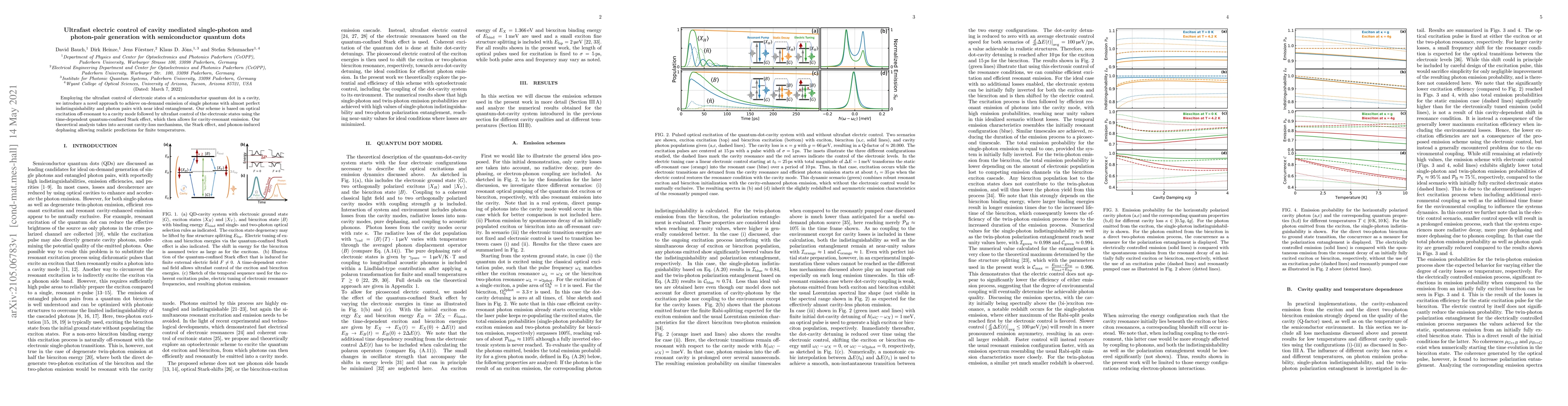 This paper presents a method for ultrafast electric control of single-photon and photon-pair generation using semiconductor quantum dots in a cavity, achieving on-demand emission with high indistinguishability and entanglement. The technique leverages off-resonant optical excitation and the time-dependent quantum-confined Stark effect for cavity-resonant emission.