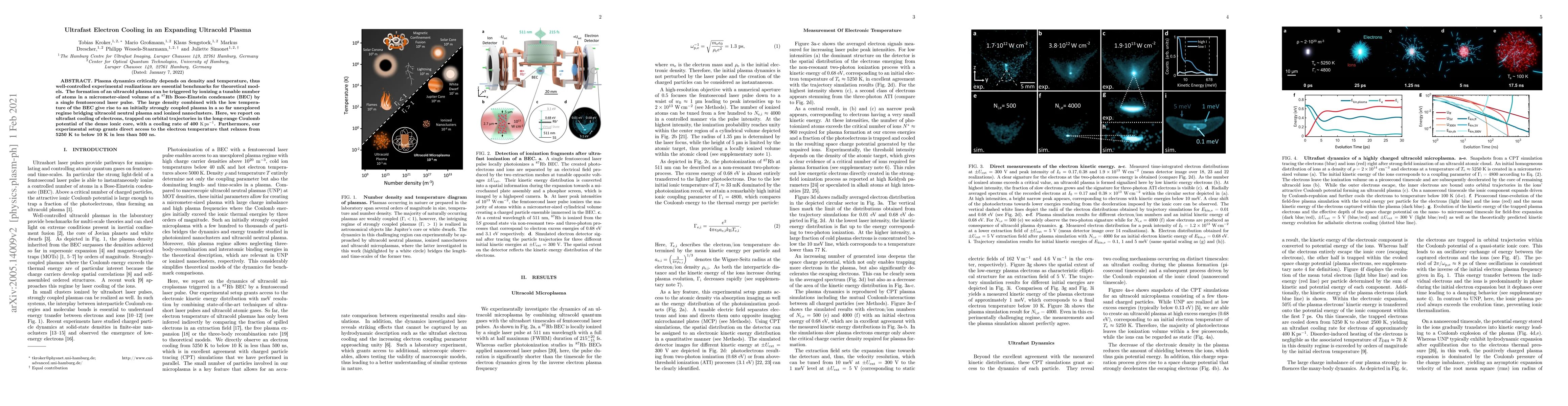 This paper reports on the ultrafast cooling of electrons in an expanding ultracold plasma formed from a Bose-Einstein condensate ionized by a femtosecond laser pulse, achieving a cooling rate of 400 K/ps and reducing electron temperature from 5250 K to below 10 K in less than 500 ns. This provides a benchmark for theoretical models of plasma dynamics.