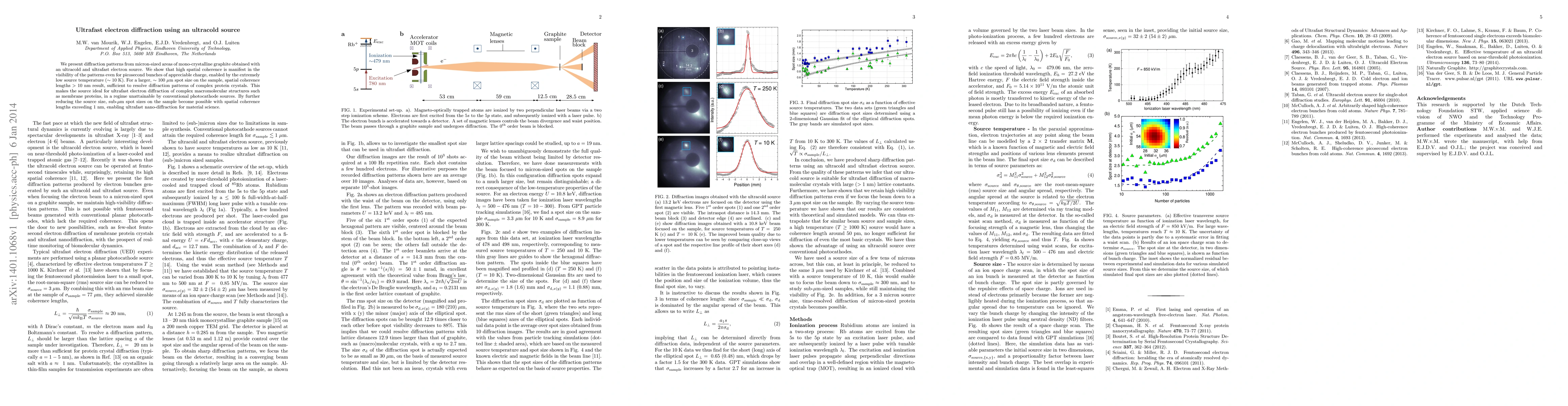This paper demonstrates ultrafast electron diffraction using an ultracold source, achieving high spatial coherence and resolving complex protein crystals. The low source temperature (~10 K) enables picosecond electron bunches with sufficient coherence for nano-diffraction applications in material science.