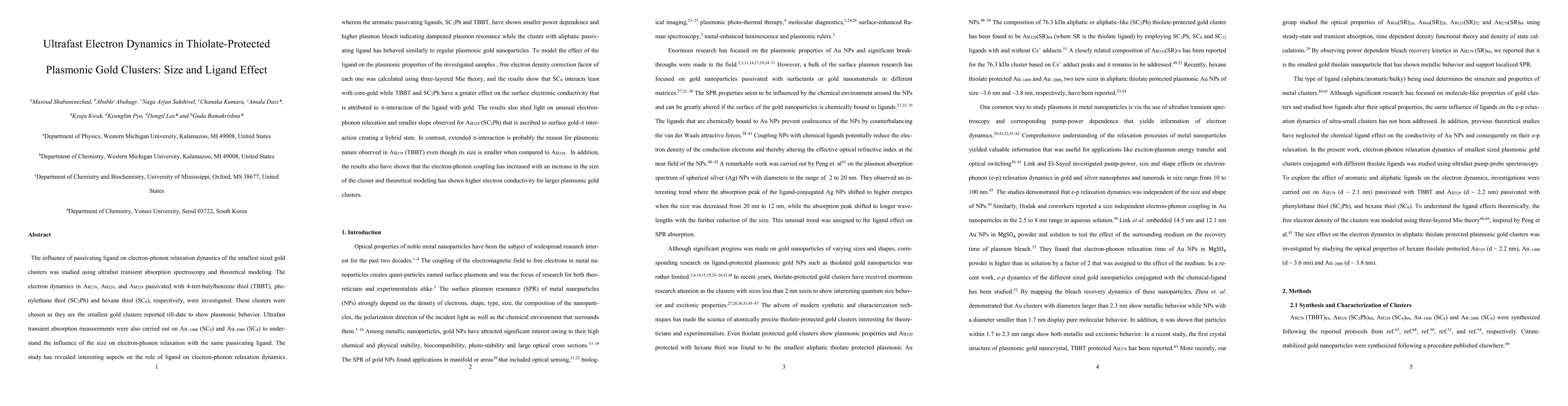 This research investigates the electron-phonon relaxation dynamics in thiolated gold clusters, revealing that aromatic ligands like SC2Ph and TBBT dampen plasmon resonance, while aliphatic ligands like SC6 behave similarly to regular gold nanoparticles. Theoretical modeling indicates that aromatic ligands enhance surface electronic conductivity via pi-interactions, influencing the clusters' plasmonic properties.