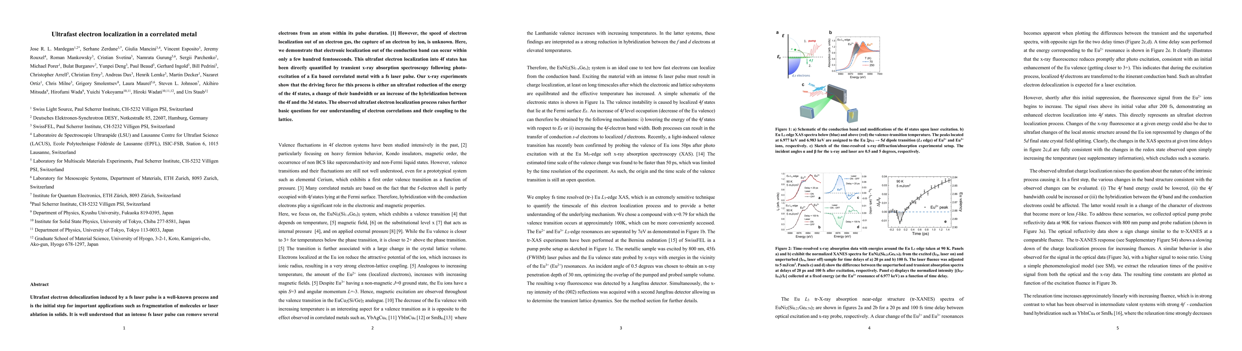 Ultrafast electron delocalization induced by a fs laser pulse is a well-known process and is the initial step for important applications such as fragmentation of molecules or laser ablation in solids. It is well understood that an intense fs laser pulse can remove several electrons from an atom within its pulse duration. [1] However, the speed of electron localization out of an electron gas, the capture of an electron by ion, is unknown. Here, we demonstrate that electronic localization out of the conduction band can occur within only a few hundred femtoseconds. This ultrafast electron localization into 4f states has been directly quantified by transient x-ray absorption spectroscopy following photo-excitation of a Eu based correlated metal with a fs laser pulse. Our x-ray experiments show that the driving force for this process is either an ultrafast reduction of the energy of the 4f states, a change of their bandwidth or an increase of the hybridization between the 4f and the 3d states. The observed ultrafast electron localization process raises further basic questions for our understanding of electron correlations and their coupling to the lattice.