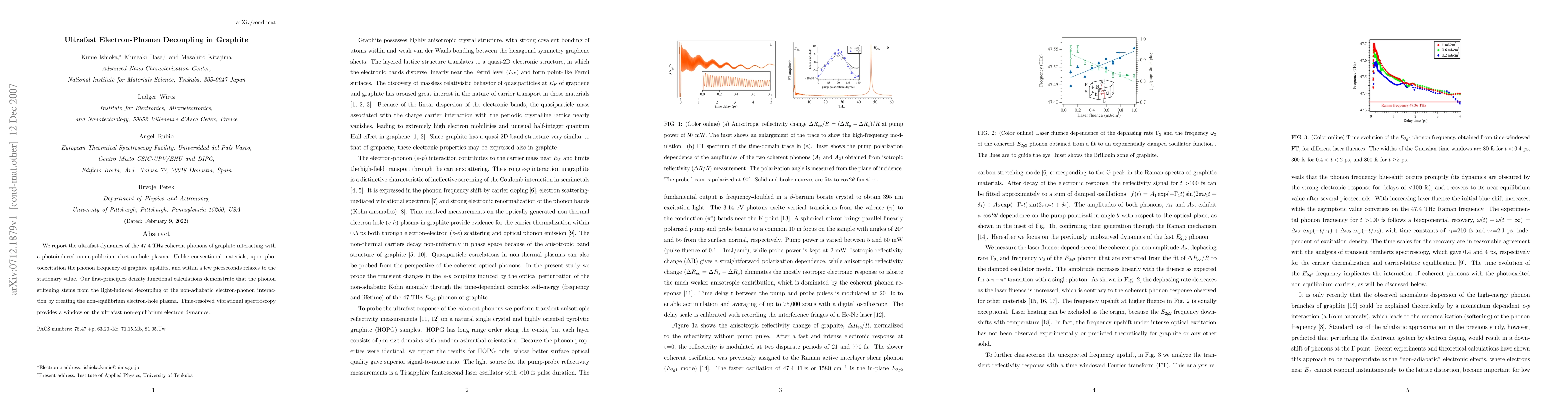 This paper investigates the ultrafast dynamics of graphite's 47.4 THz coherent phonons interacting with a photoinduced electron-hole plasma, revealing an upshift in phonon frequency upon photoexcitation that rapidly relaxes. Density functional calculations suggest this phenomenon arises from the non-adiabatic decoupling of electron-phonon interactions.
