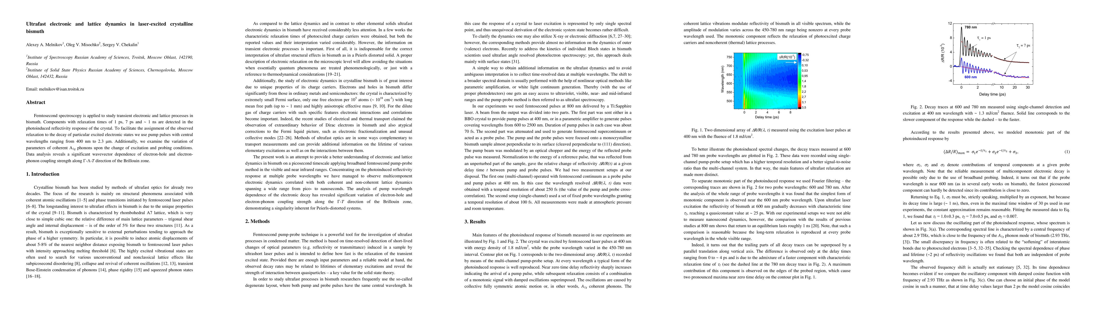 This paper uses femtosecond spectroscopy to investigate ultrafast electronic and lattice dynamics in laser-excited bismuth, identifying relaxation processes with times of 1 ps, 7 ps, and ~1 ns. The study reveals significant wavevector dependence of electron-hole and electron-phonon coupling along the \Gamma-T direction of the Brillouin zone.