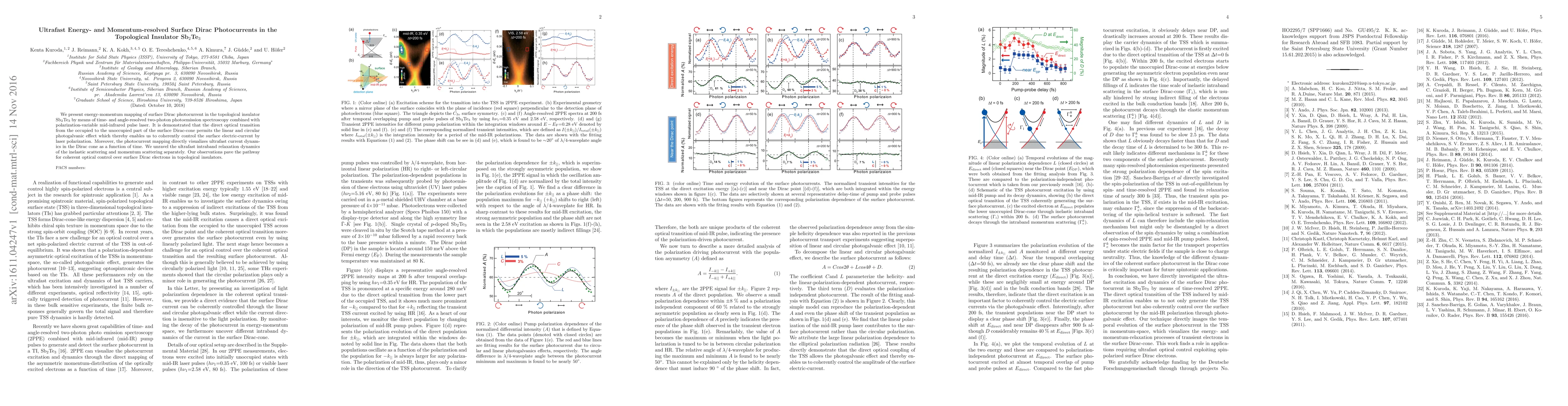 This paper utilizes time- and angle-resolved two-photon photoemission spectroscopy to map surface Dirac photocurrents in Sb$_2$Te$_3$, demonstrating linear and circular photogalvanic effects through direct optical transitions. It reveals ultrafast intraband and momentum relaxation dynamics, enabling coherent optical control of surface electric current via laser polarization.