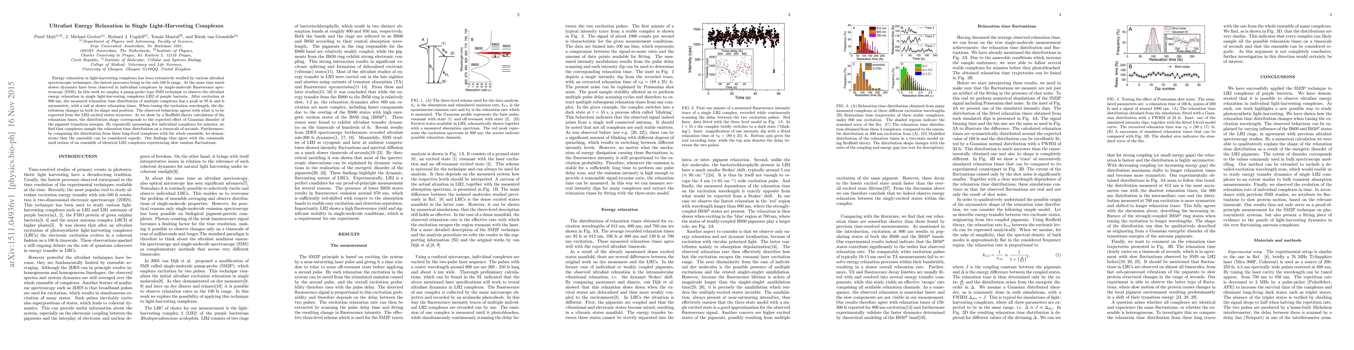 This paper investigates ultrafast energy relaxation in single LH2 light-harvesting complexes using a pump-probe technique, revealing a peak relaxation time of 95 fs and an asymmetric distribution with slower tails. The study confirms the LH2 excited states structure and ergodic behavior of the ensemble.
