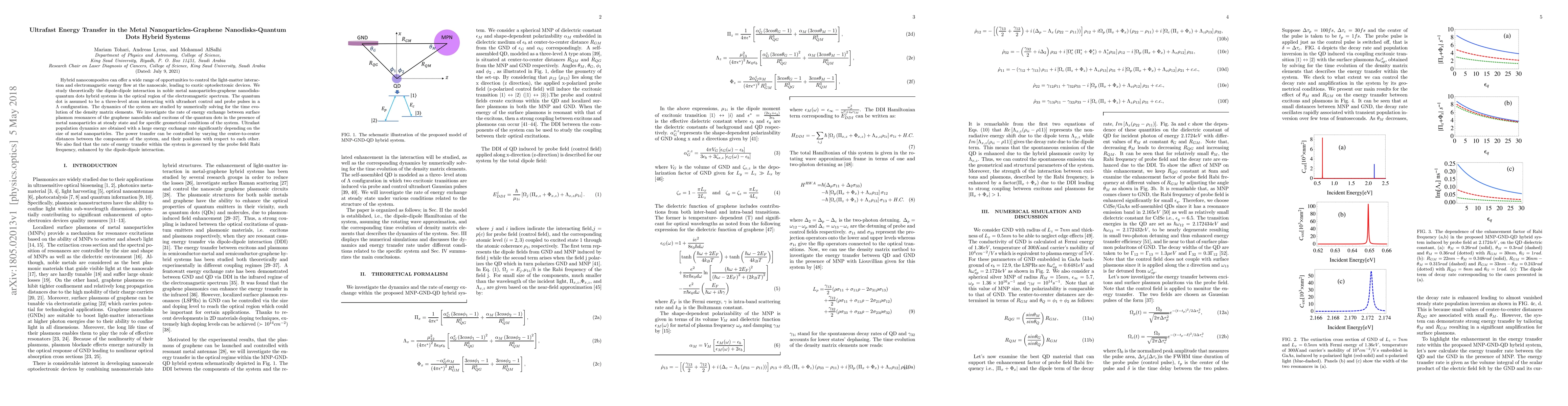 Hybrid nanocomposites can offer a wide range of opportunities to control the light-matter interac- tion and electromagnetic energy flow at the nanoscale, leading to exotic optoelectronic devices. We study theoretically the dipole-dipole interaction in noble metal nanoparticles-graphene nanodisks- quantum dots hybrid systems in the optical region of the electromagnetic spectrum. The quantum dot is assumed to be a three-level atom interacting with ultrashort control and probe pulses in a Lambda configuration. The dynamics of the system are studied by numerically solving for the time evo- lution of the density matrix elements. We investigate the rate of energy exchange between surface plasmon resonances of the graphene nanodisks and excitons of the quantum dots in the presence of metal nanoparticles at steady state and for specific geometrical conditions of the system. Ultrafast population dynamics are obtained with a large energy exchange rate significantly depending on the size of metal nanoparticles. The power transfer can be controlled by varying the center-to-center distances between the components of the system, and their positions with respect to each other. We also find that the rate of energy transfer within the system is governed by the probe field Rabi frequency, enhanced by the dipole-dipole interaction.