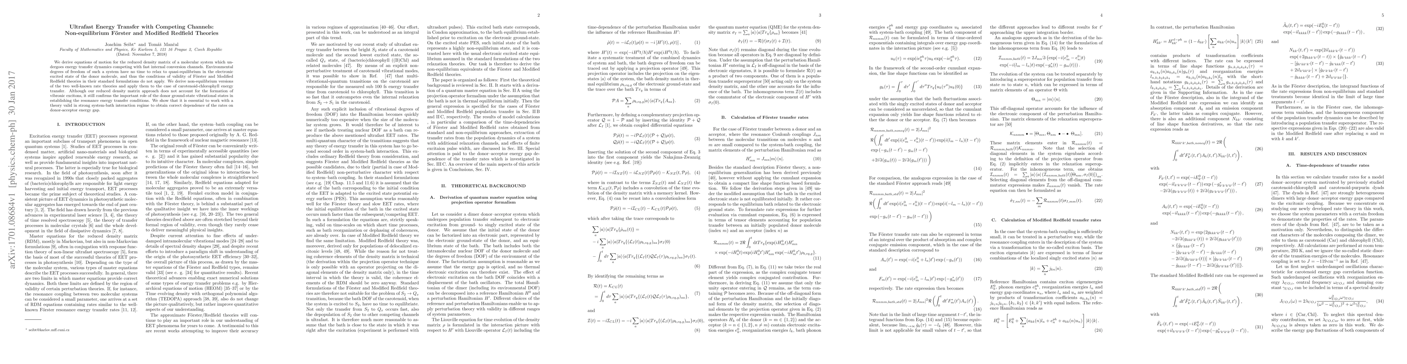 This paper develops non-equilibrium versions of Foerster and Modified Redfield theories to describe energy transfer dynamics in molecular systems with competing fast internal conversion channels. It applies these theories to carotenoid-chlorophyll energy transfer, confirming the significance of donor ground-state vibrational states in resonance energy transfer.