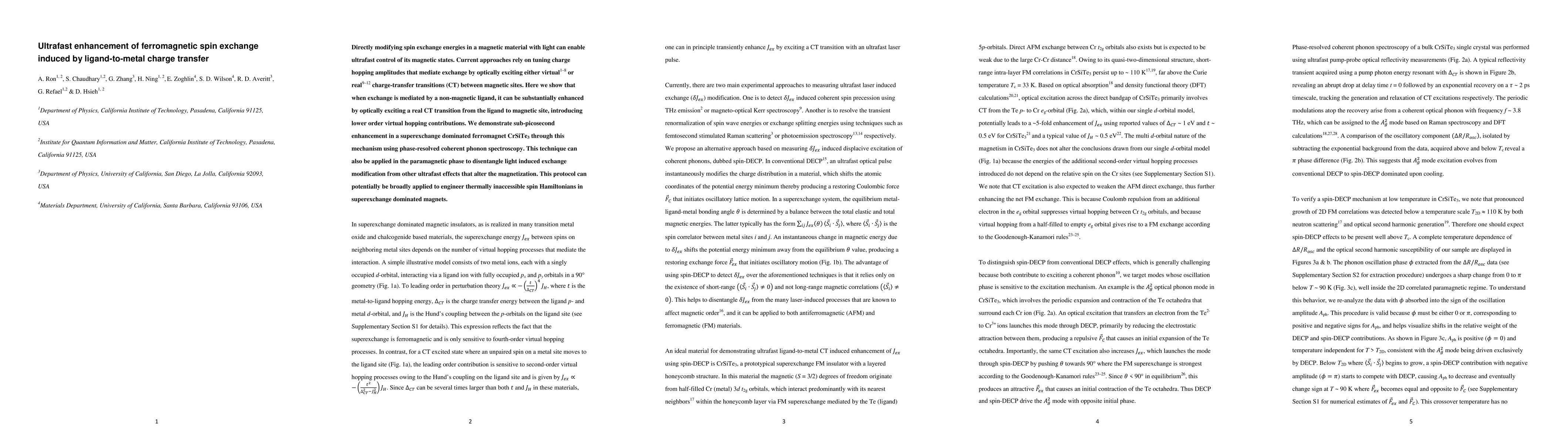 Directly modifying spin exchange energies in a magnetic material with light can enable ultrafast control of its magnetic states. Current approaches rely on tuning charge hopping amplitudes that mediate exchange by optically exciting either virtual or real charge-transfer transitions (CT) between magnetic sites. Here we show that when exchange is mediated by a non-magnetic ligand, it can be substantially enhanced by optically exciting a real CT transition from the ligand to magnetic site, introducing lower order virtual hopping contributions. We demonstrate sub-picosecond enhancement in a superexchange dominated ferromagnet CrSiTe3 through this mechanism using phase-resolved coherent phonon spectroscopy. This technique can also be applied in the paramagnetic phase to disentangle light induced exchange modification from other ultrafast effects that alter the magnetization. This protocol can potentially be broadly applied to engineer thermally inaccessible spin Hamiltonians in superexchange dominated magnets.