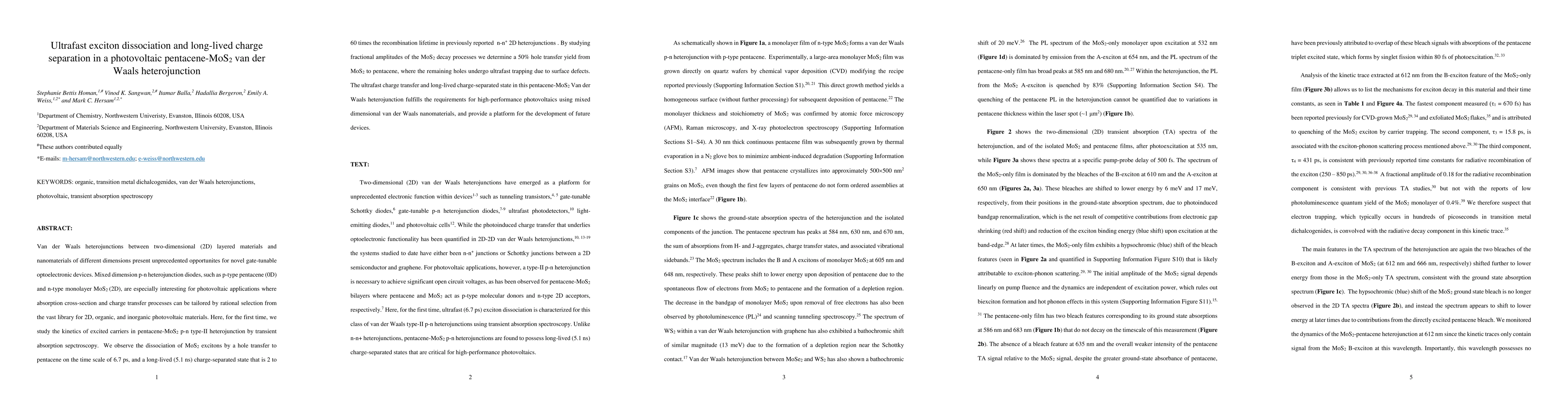 This study investigates ultrafast exciton dissociation and long-lived charge separation in pentacene-MoS2 van der Waals heterojunctions using transient absorption spectroscopy. The results show rapid hole transfer from MoS2 to pentacene within 6.7 ps and a charge-separated state lasting 5.1 ns, indicating potential for advanced optoelectronic applications.