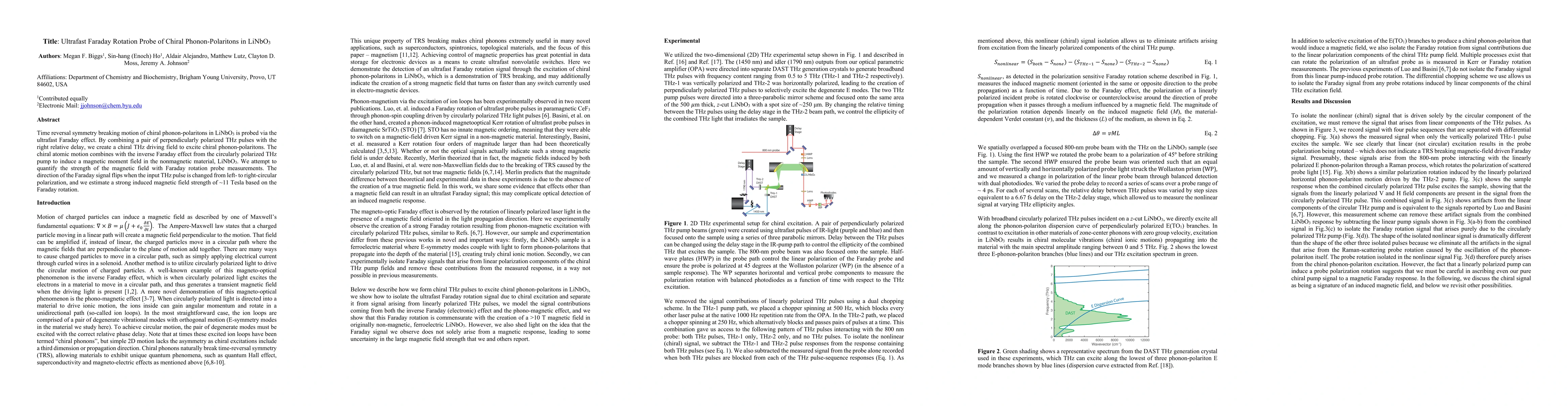 Time reversal symmetry breaking motion of chiral phonon-polaritons in LiNbO3 is probed via the ultrafast Faraday effect. By combining a pair of perpendicularly polarized THz pulses with the right relative delay, we create a chiral THz driving field to excite chiral phonon-polaritons. The chiral atomic motion combines with the inverse Faraday effect from the circularly polarized THz pump to induce a magnetic moment field in the nonmagnetic material, LiNbO3. We attempt to quantify the strength of the magnetic field with Faraday rotation probe measurements. The direction of the Faraday signal flips when the input THz pulse is changed from left- to right-circular polarization, and we estimate a strong induced magnetic field strength of ~11 Tesla based on the Faraday rotation.