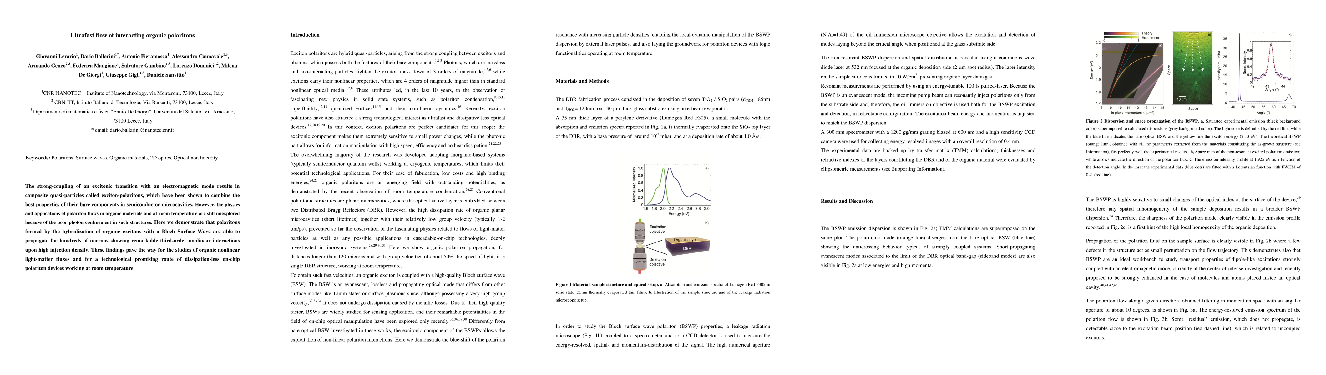 This paper demonstrates the propagation of exciton-polaritons formed from organic excitons and Bloch Surface Waves over hundreds of microns, showcasing significant third-order nonlinear interactions at high injection densities. These findings open new avenues for organic nonlinear light-matter interactions and potential room-temperature on-chip polariton devices.