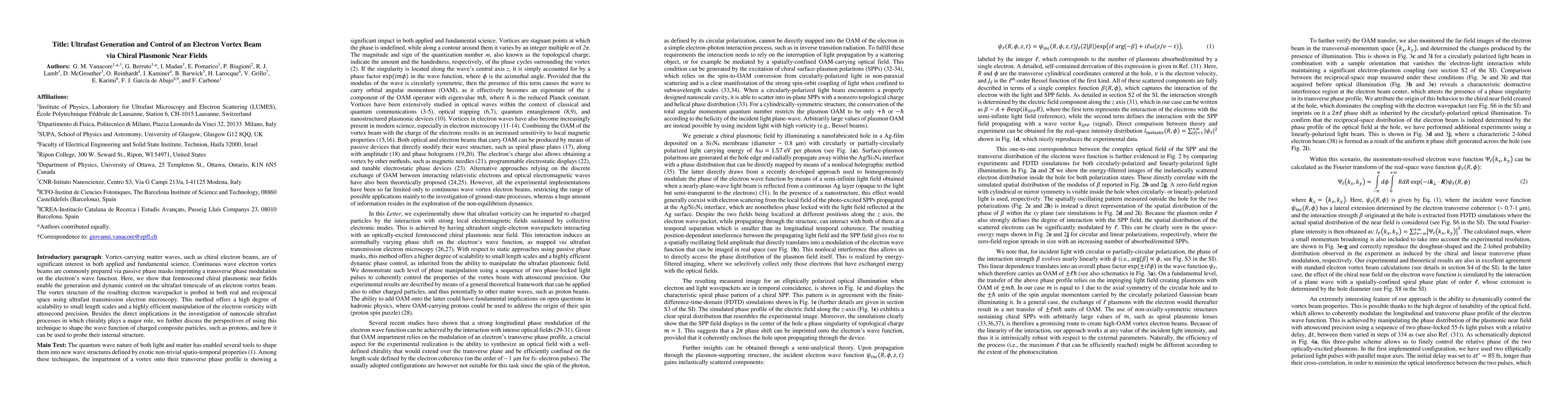 This paper demonstrates the ultrafast generation and control of chiral electron vortex beams using femtosecond plasmonic near fields, enabling precise manipulation at attosecond precision. The method is scalable and can probe nanoscale processes, with potential applications in shaping wave functions of charged particles like protons.