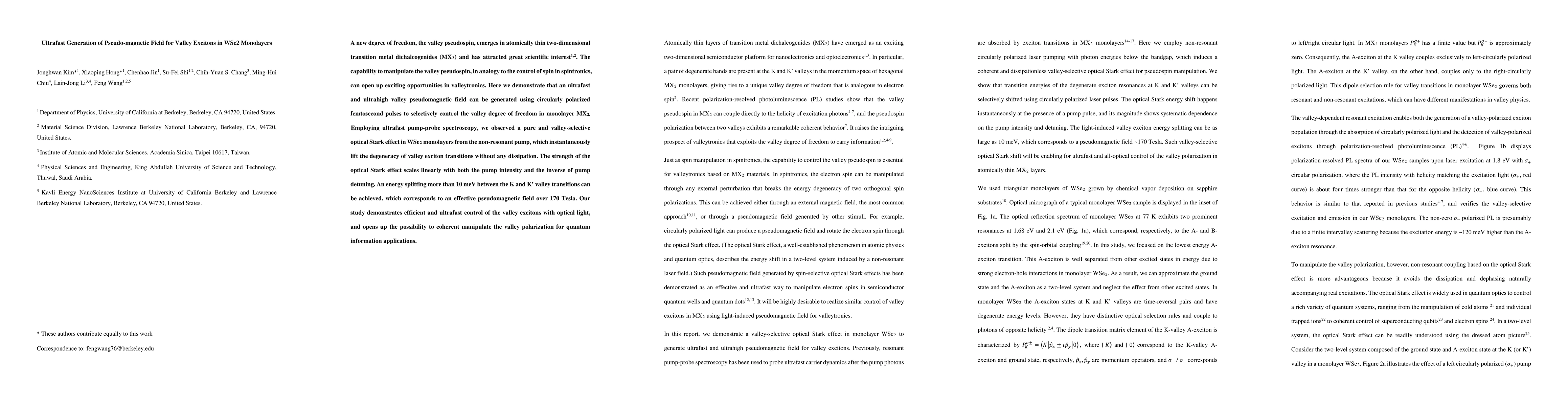 This paper demonstrates the ultrafast generation of a pseudomagnetic field in WSe2 monolayers using circularly polarized femtosecond pulses, enabling the selective control of valley pseudospin through an optical Stark effect. This method achieves an energy splitting of over 10 meV, corresponding to an effective pseudomagnetic field exceeding 170 Tesla, paving the way for quantum information applications in valleytronics.