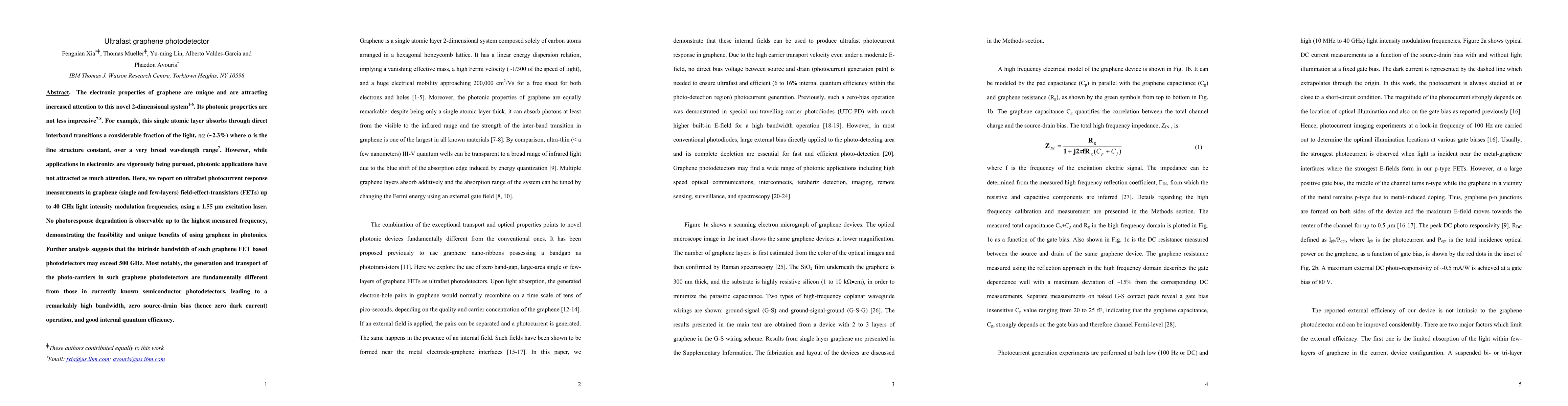 This paper reports on ultrafast photocurrent response measurements in graphene field-effect-transistors, demonstrating a bandwidth exceeding 500 GHz and no photoresponse degradation up to 40 GHz. The study highlights graphene's unique photonic properties and potential for high-speed photodetector applications.