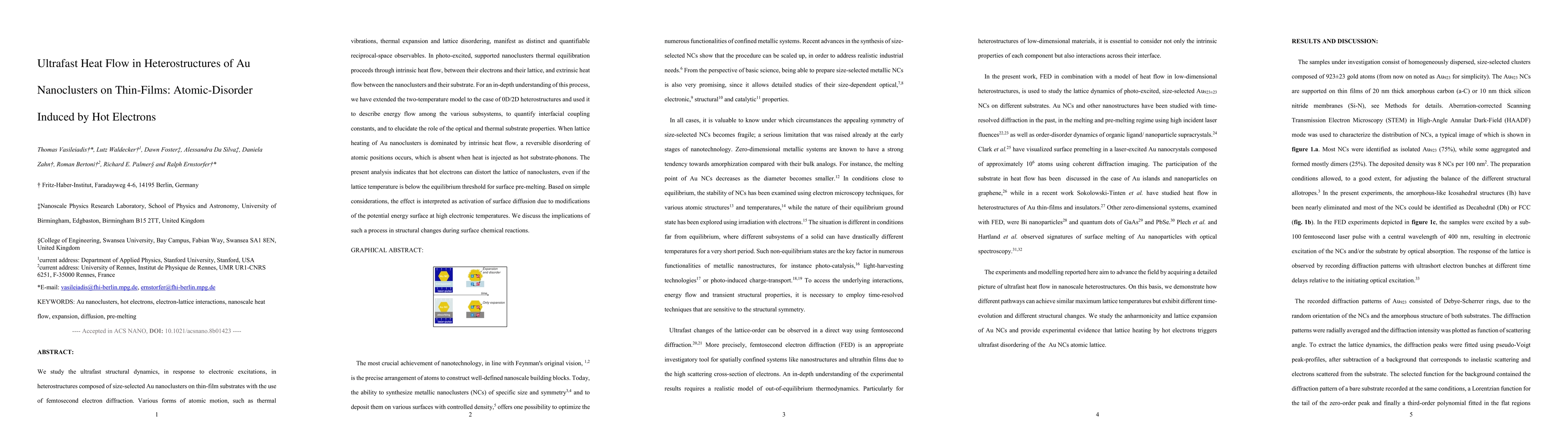 This paper investigates ultrafast heat flow dynamics in Au nanoclusters on thin-film substrates via femtosecond electron diffraction, revealing atomic disorder induced by hot electrons. The study extends the two-temperature model to 0D/2D heterostructures, showing that intrinsic heat flow from excited electrons can induce reversible lattice disorder even when the lattice temperature is below the melting threshold.
