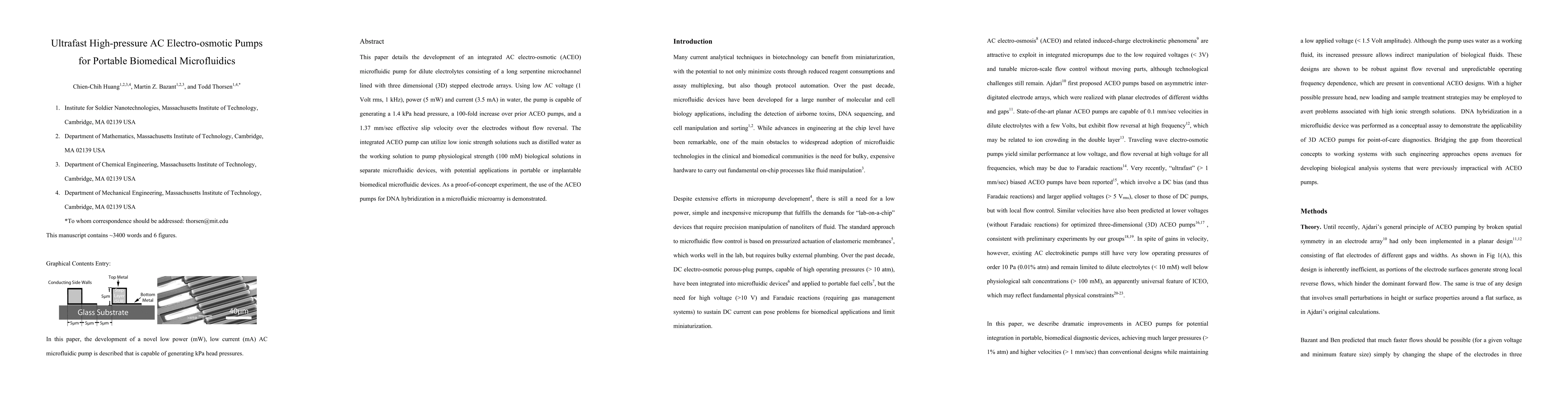 Researchers developed an ultrafast high-pressure AC electro-osmotic pump for portable biomedical microfluidics, achieving a 100-fold increase in pressure over previous pumps. The pump can efficiently handle physiological-strength solutions with minimal power consumption and potential applications in implantable devices.