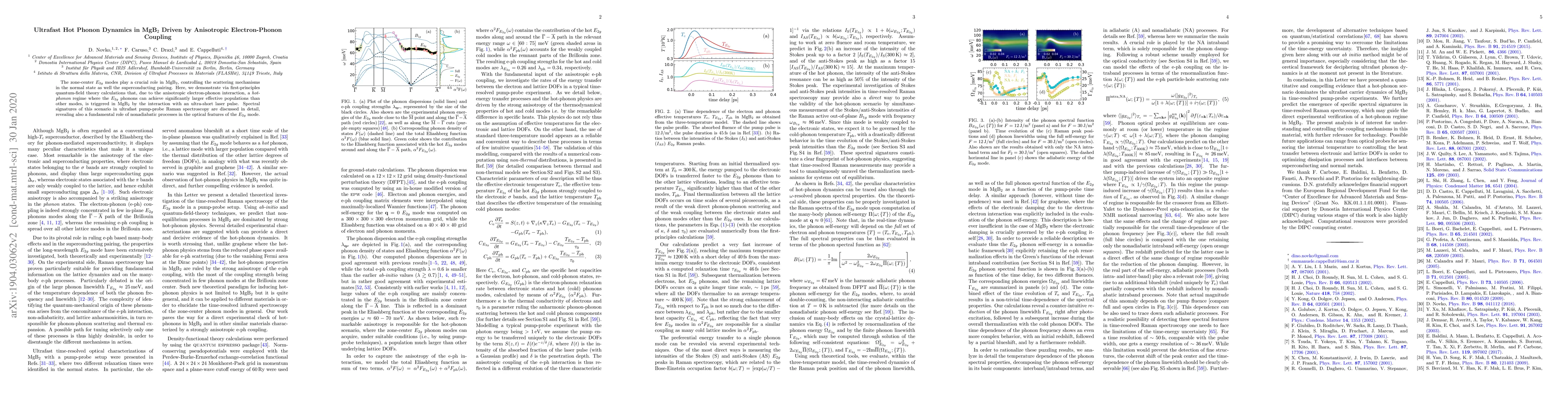 The zone-center $E_{2g}$ modes play a crucial role in MgB$_2$, controlling the scattering mechanisms in the normal state as well the superconducting pairing. Here, we demonstrate via first-principles quantum-field theory calculations that, due to the anisotropic electron-phonon interaction, a $hot$-$phonon$ regime where the $E_{2g}$ phonons can achieve significantly larger effective populations than other modes, is triggered in MgB$_2$ by the interaction with an ultra-short laser pulse. Spectral signatures of this scenario in ultrafast pump-probe Raman spectroscopy are discussed in detail, revealing also a fundamental role of nonadiabatic processes in the optical features of the $E_{2g}$ mode.