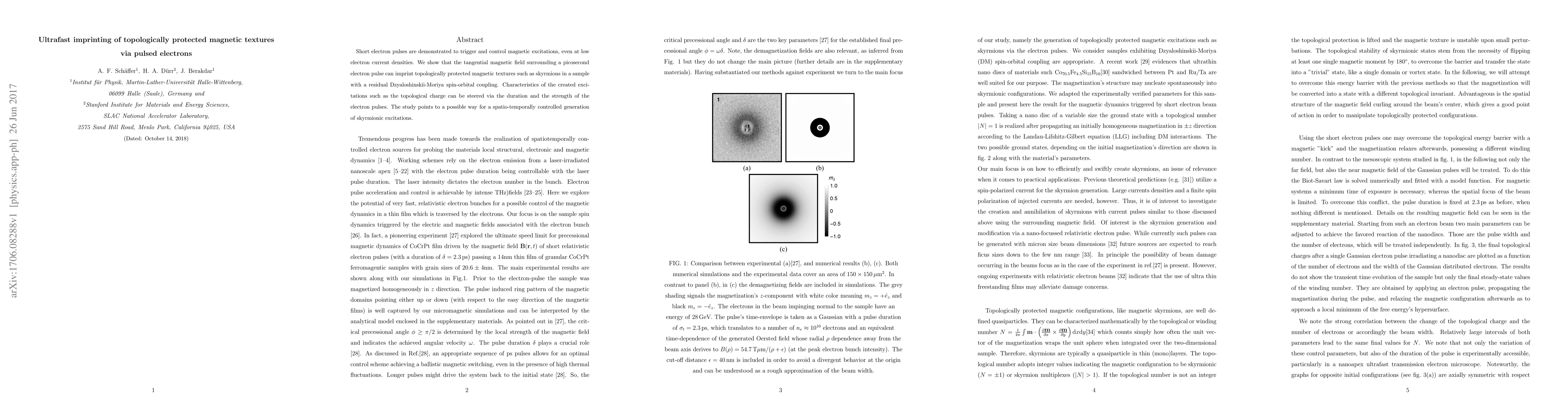 This paper demonstrates the use of ultrafast electron pulses to create and manipulate topologically protected magnetic textures, such as skyrmions, in materials with Dzyaloshinskii-Moriya spin-orbital coupling. The study shows that the magnetic properties can be controlled by adjusting the pulse duration and strength, indicating potential for precise skyrmion generation.