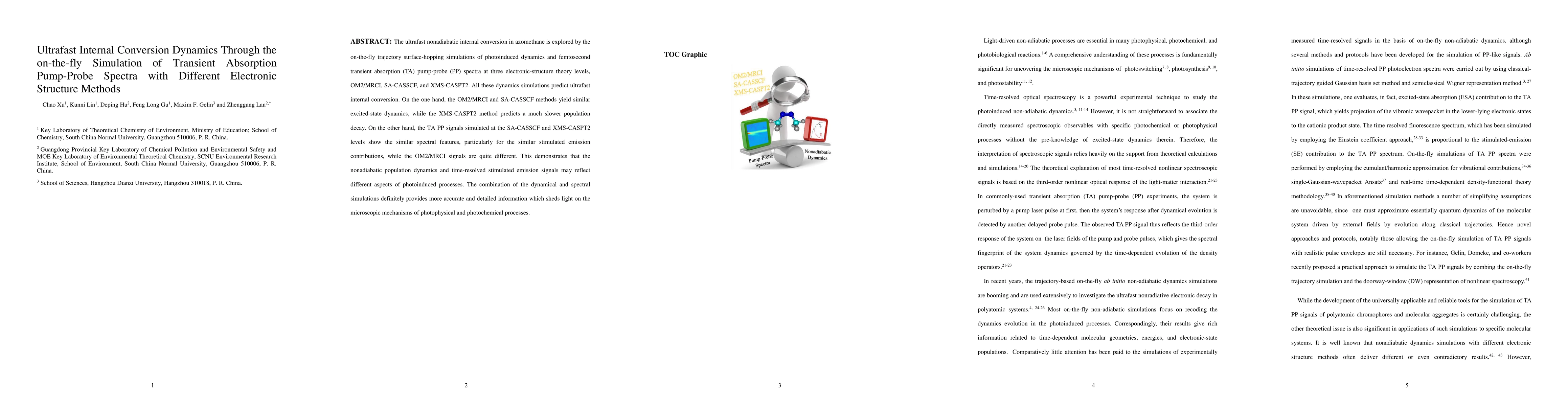 This paper investigates ultrafast internal conversion in azomethane using on-the-fly simulations of transient absorption pump-probe spectra, comparing three electronic structure methods. The results show that while OM2/MRCI and SA-CASSCF predict similar excited-state dynamics, XMS-CASPT2 predicts a slower decay, and spectral features differ significantly between methods, highlighting the complexity of photoinduced processes.