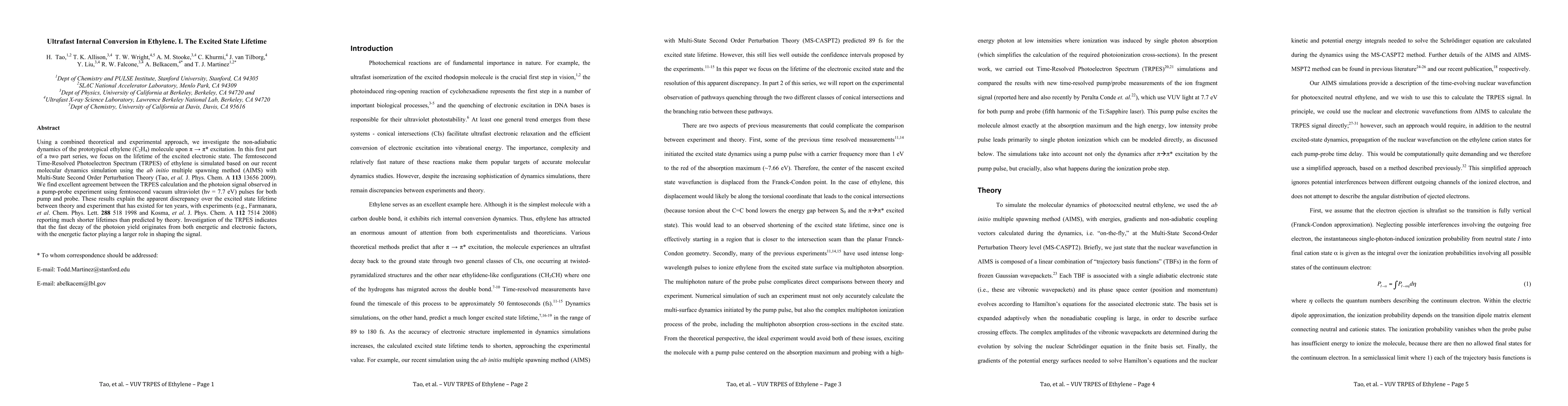 This paper combines theoretical and experimental methods to study the ultrafast internal conversion in ethylene upon π→π* excitation, focusing on the excited state lifetime. The femtosecond Time-Resolved Photoelectron Spectrum (TRPES) simulation using ab initio multiple spawning method aligns well with experimental pump-probe results, resolving a decade-long discrepancy in the reported excited state lifetimes.
