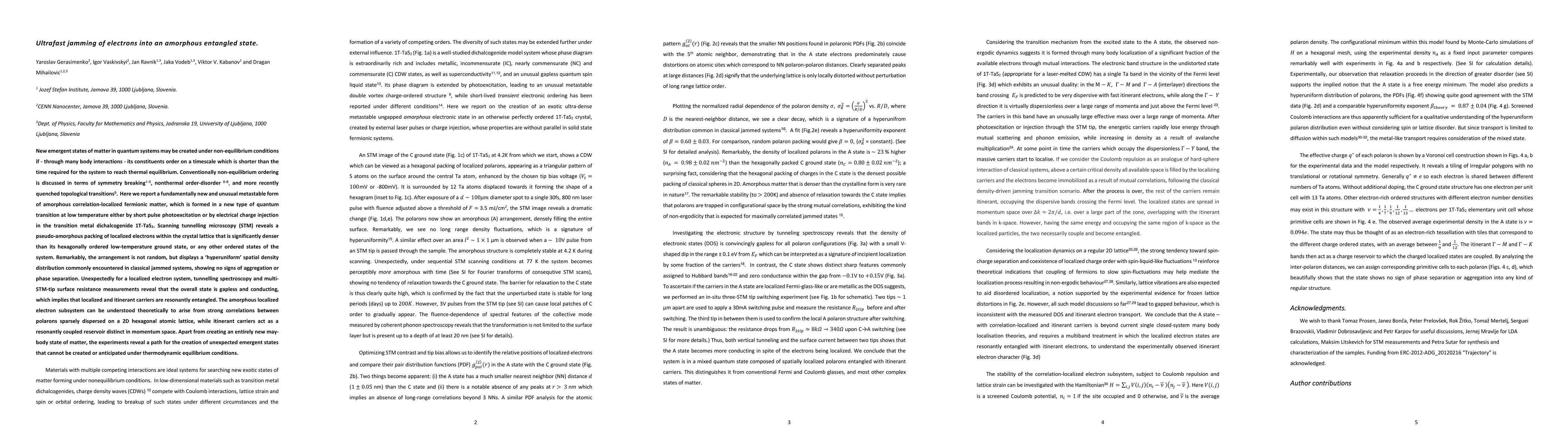 New emergent states of matter in quantum systems may be created under non-equilibrium conditions if - through many body interactions - its constituents order on a timescale which is shorter than the time required for the system to reach thermal equilibrium. Conventionally non-equilibrium ordering is discussed in terms of symmetry breaking, nonthermal order-disorder, and more recently quenched topological transitions. Here we report a fundamentally new and unusual metastable form of amorphous correlation-localized fermionic matter, which is formed in a new type of quantum transition at low temperature either by short pulse photoexcitation or by electrical charge injection in the transition metal dichalcogenide 1T-TaS2. Scanning tunnelling microscopy (STM) reveals a pseudo-amorphous packing of localized electrons within the crystal lattice that is significantly denser than its hexagonally ordered low-temperature ground state, or any other ordered states of the system. Remarkably, the arrangement is not random, but displays a hyperuniform spatial density distribution commonly encountered in classical jammed systems, showing no signs of aggregation or phase separation. Unexpectedly for a localized electron system, tunnelling spectroscopy and multi- STM-tip surface resistance measurements reveal that the overall state is gapless and conducting, which implies that localized and itinerant carriers are resonantly entangled. The amorphous localized electron subsystem can be understood theoretically to arise from strong correlations between polarons sparsely dispersed on a 2D hexagonal atomic lattice, while itinerant carriers act as a resonantly coupled reservoir distinct in momentum space.