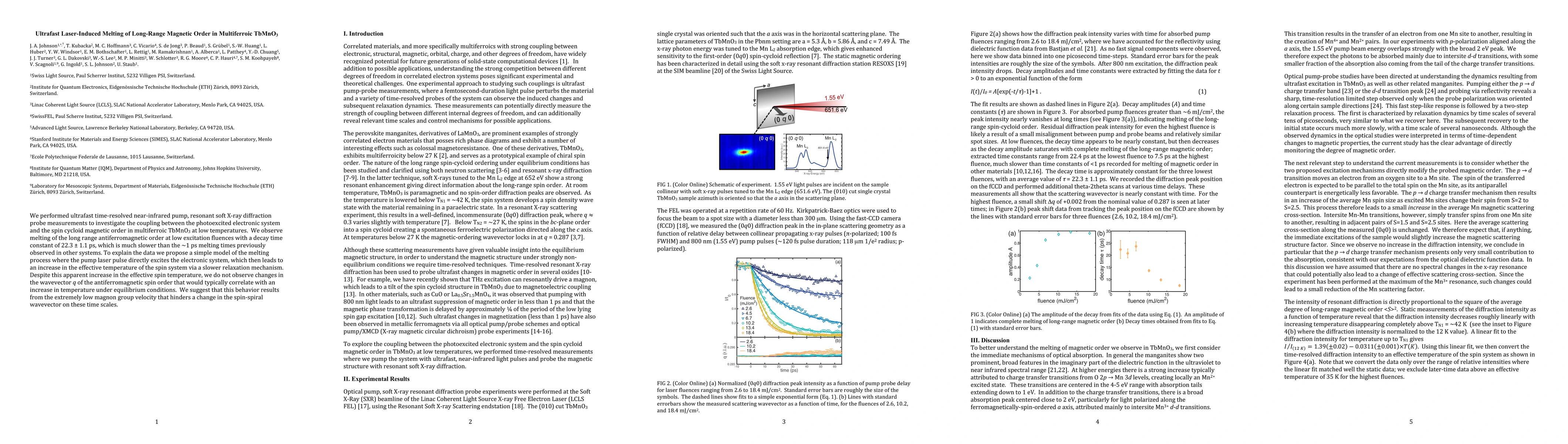 This study investigates the ultrafast laser-induced melting of long-range magnetic order in multiferroic TbMnO3, observing a 22.3 ps decay time for antiferromagnetic order, much slower than in other systems. The proposed model attributes this to a slower relaxation mechanism following electronic excitation, without changes in the spin-spiral wavevector due to low magnon group velocity.