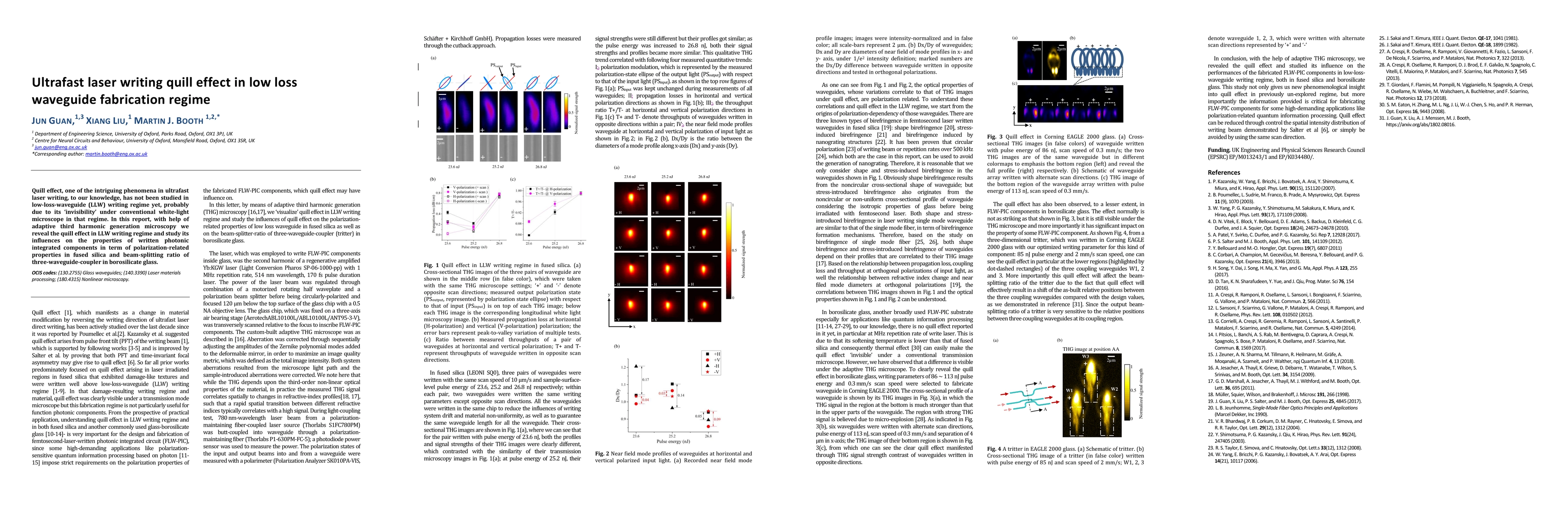 This paper investigates the quill effect in ultrafast laser writing for low-loss waveguide fabrication, revealing its presence using adaptive third harmonic generation microscopy. The study examines its impact on polarization-related properties in fused silica and beam-splitting ratios in three-waveguide-couplers in borosilicate glass.