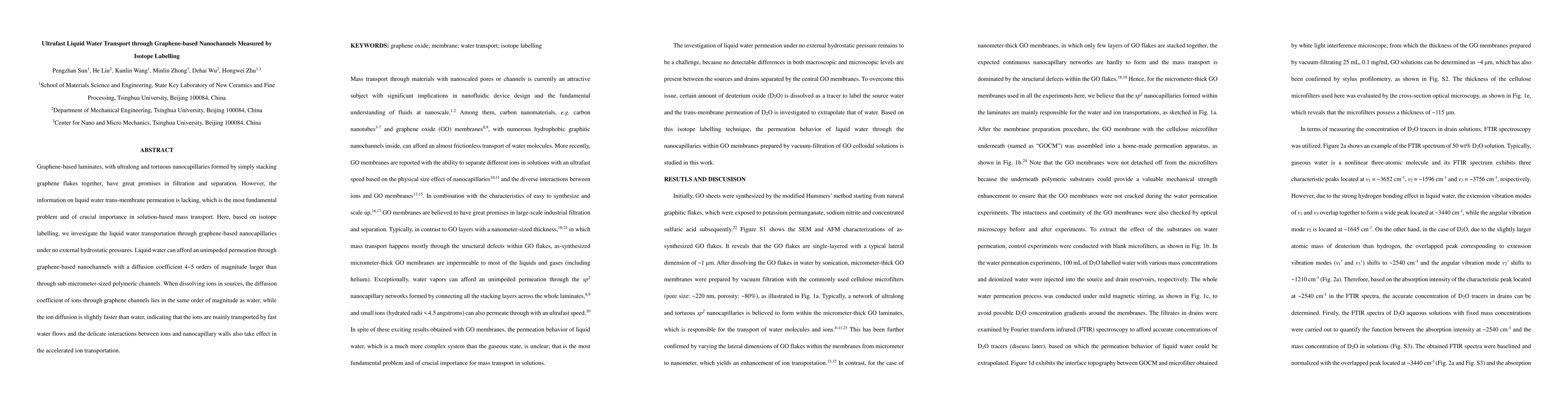 This study investigates ultrafast liquid water transport through graphene-based nanochannels using isotope labelling, revealing a diffusion coefficient 4-5 orders of magnitude higher than in polymeric channels. Ions also diffuse rapidly through the graphene channels, primarily due to fast water flows, with interactions between ions and channel walls further enhancing their transport.