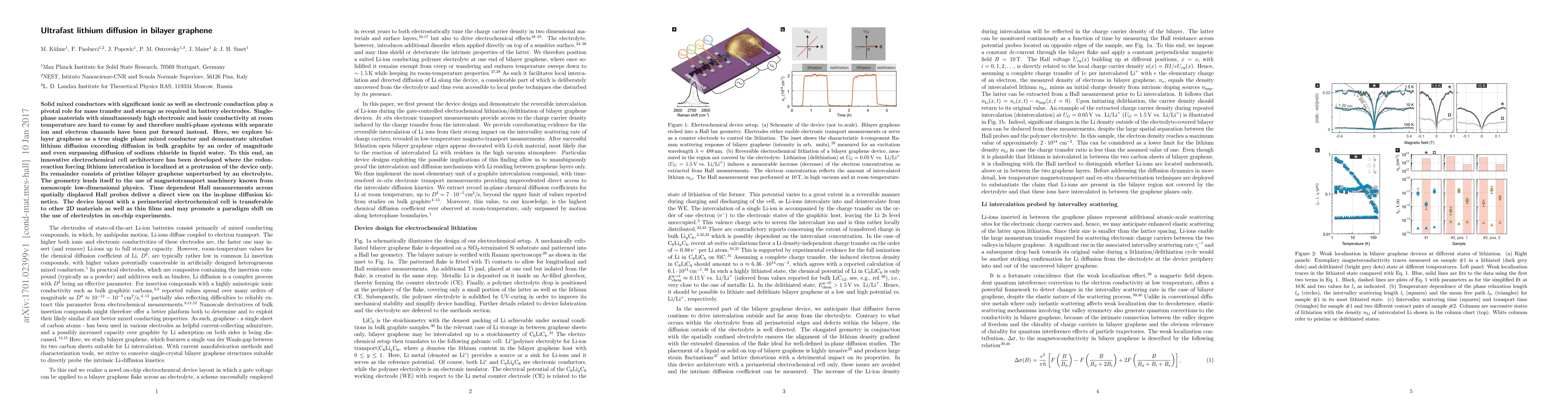 Solid mixed conductors with significant ionic as well as electronic conduction play a pivotal role for mass transfer and storage as required in battery electrodes. Single-phase materials with simultaneously high electronic and ionic conductivity at room temperature are hard to come by and therefore multi-phase systems with separate ion and electron channels have been put forward instead. Here, we explore bilayer graphene as a true single phase mixed conductor and demonstrate ultrafast lithium diffusion exceeding diffusion in bulk graphite by an order of magnitude and even surpassing diffusion of sodium chloride in liquid water. To this end, an innovative electrochemical cell architecture has been developed where the redox-reaction forcing lithium intercalation is localized at a protrusion of the device only. Its remainder consists of pristine bilayer graphene unperturbed by an electrolyte. The geometry lends itself to the use of magnetotransport machinery known from mesoscopic low-dimensional physics. Time dependent Hall measurements across spatially displaced Hall probes deliver a direct view on the in-plane diffusion kinetics. The device layout with a perimeterial electrochemical cell is transferable to other 2D materials as well as thin films and may promote a paradigm shift on the use of electrolytes in on-chip experiments.
