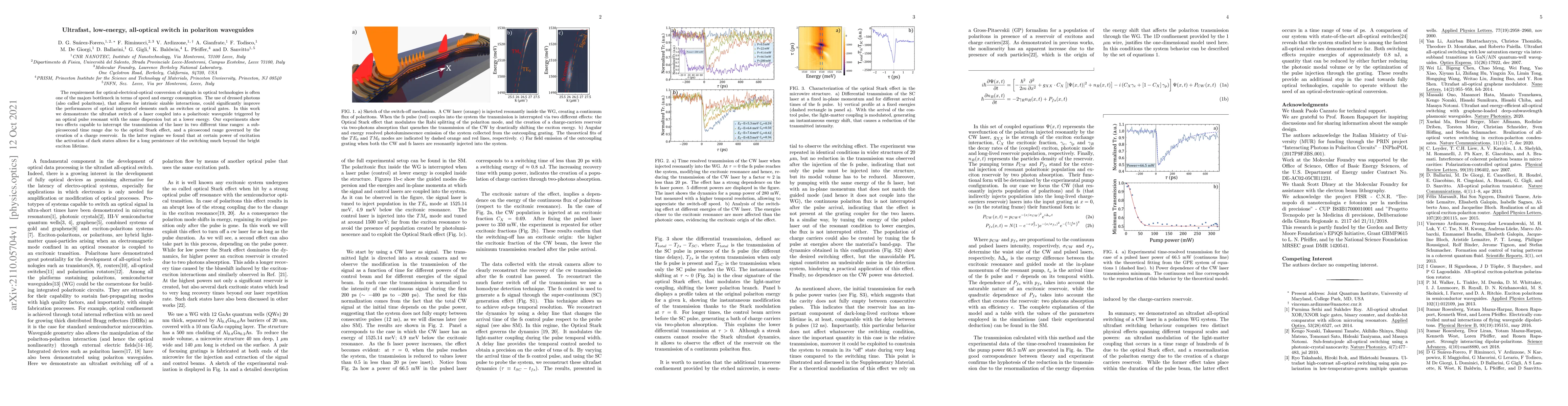 The requirement for optical-electrical-optical conversion of signals in optical technologies is often one of the majors bottleneck in terms of speed and energy consumption. The use of dressed photons (also called polaritons), that allows for intrinsic sizable interactions, could significantly improve the performances of optical integrated elements such as switches or optical gates. In this work we demonstrate the ultrafast switch of a laser coupled into a polaritonic waveguide triggered by an optical pulse resonant with the same dispersion but at a lower energy. Our experiments show two effects capable to interrupt the transmission of the laser in two different time ranges: a sub-picosecond time range due to the optical Stark effect, and a picosecond range governed by the creation of a charge reservoir. In the latter regime we found that at certain power of excitation the activation of dark states allows for a long persistence of the switching much beyond the bright exciton lifetime.