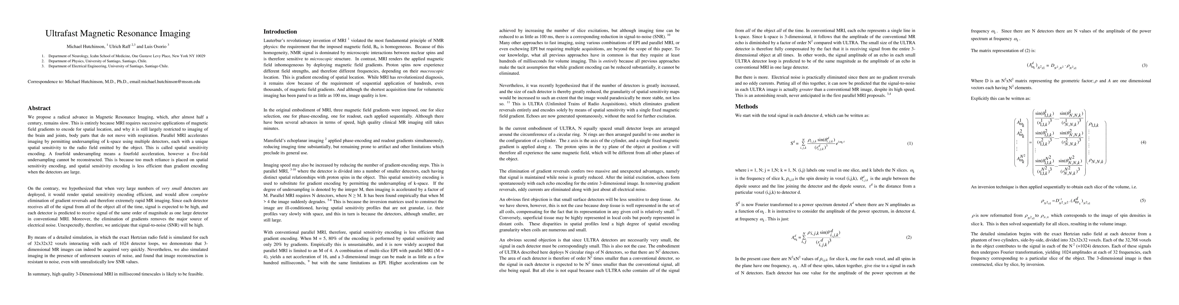 This research proposes a significant advancement in MRI by using numerous small detectors to achieve spatial sensitivity encoding, eliminating the need for gradient reversals, and thus drastically speeding up imaging. Simulations show that high-quality 3D MRI can be acquired in milliseconds, with robust noise resistance.