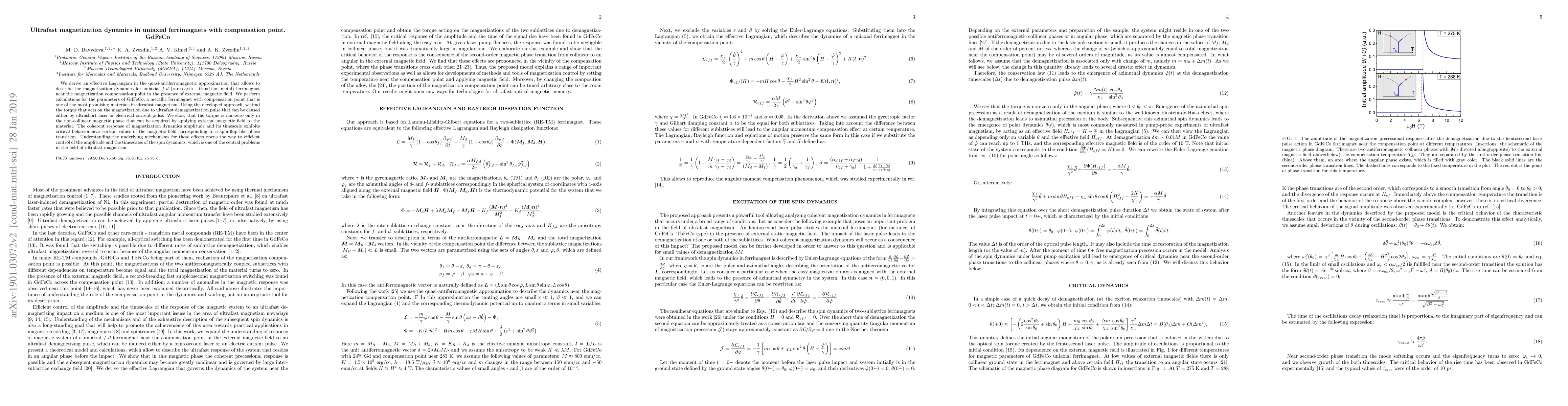 This paper develops an effective Lagrangian to describe magnetization dynamics in uniaxial ferrimagnets near the compensation point, focusing on GdFeCo. It reveals a non-zero torque on magnetization due to ultrafast demagnetization pulses, showing critical behavior near specific magnetic field values, which could enable efficient control of spin dynamics in ultrafast magnetism.