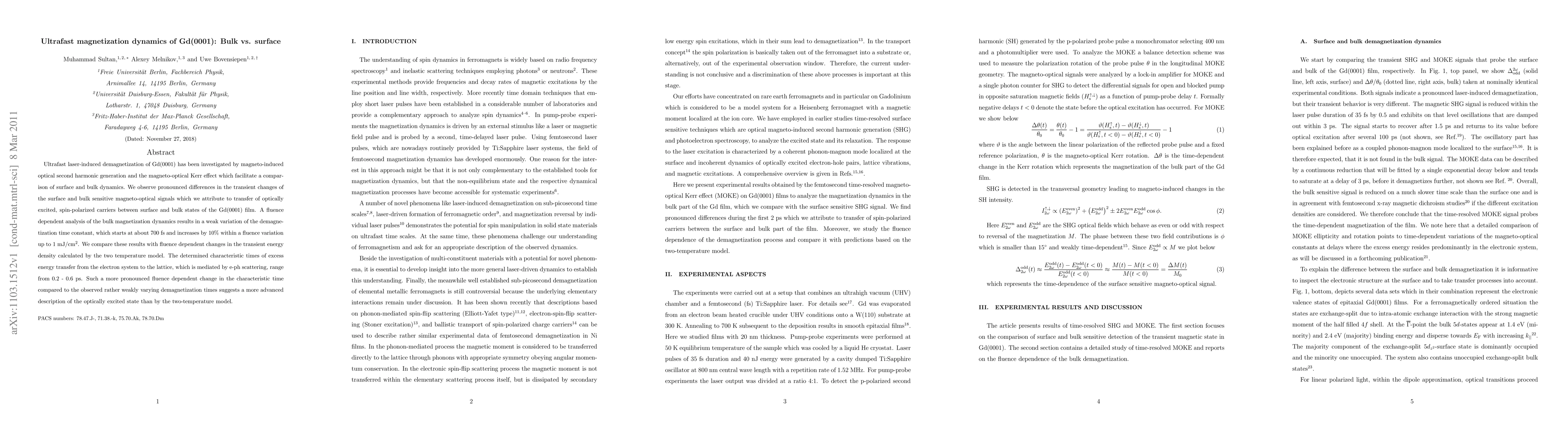 Ultrafast laser-induced demagnetization of Gd(0001) has been investigated by magneto-induced optical second harmonic generation and the magneto-optical Kerr effect which facilitate a comparison of surface and bulk dynamics. We observe pronounced differences in the transient changes of the surface and bulk sensitive magneto-optical signals which we attribute to transfer of optically excited, spin-polarized carriers between surface and bulk states of the Gd(0001) film. A fluence dependent analysis of the bulk magnetization dynamics results in a weak variation of the demagnetization time constant, which starts at about 700 fs and increases by 10% within a fluence variation up to 1 mJ/cm2. We compare these results with fluence dependent changes in the transient energy density calculated by the two temperature model. The determined characteristic times of excess energy transfer from the electron system to the lattice, which is mediated by e-ph scattering, range from 0.2 - 0.6 ps. Such a more pronounced fluence dependent change in the characteristic time compared to the observed rather weakly varying demagnetization times suggests a more advanced description of the optically excited state than by the two-temperature model.