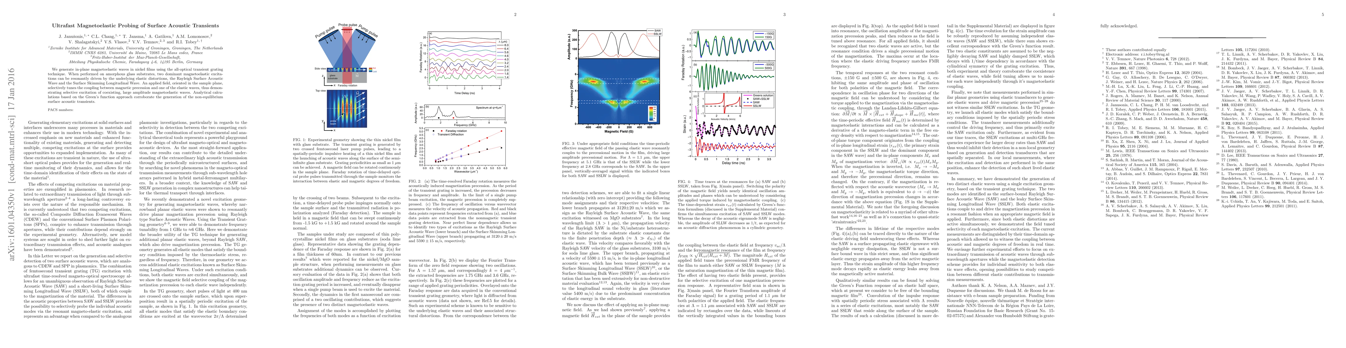 We generate in-plane magnetoelastic waves in nickel films using the all-optical transient grating technique. When performed on amorphous glass substrates, two dominant magnetoelastic excitations can be resonantly driven by the underlying elastic distortions, the Rayleigh Surface Acoustic Wave and the Surface Skimming Longitudinal Wave. An applied field, oriented in the sample plane, selectively tunes the coupling between magnetic precession and one of the elastic waves, thus demonstrating selective excitation of coexisting, large amplitude magnetoelastic waves. Analytical calculations based on the Green's function approach corroborate the generation of the non-equilibrium surface acoustic transients.