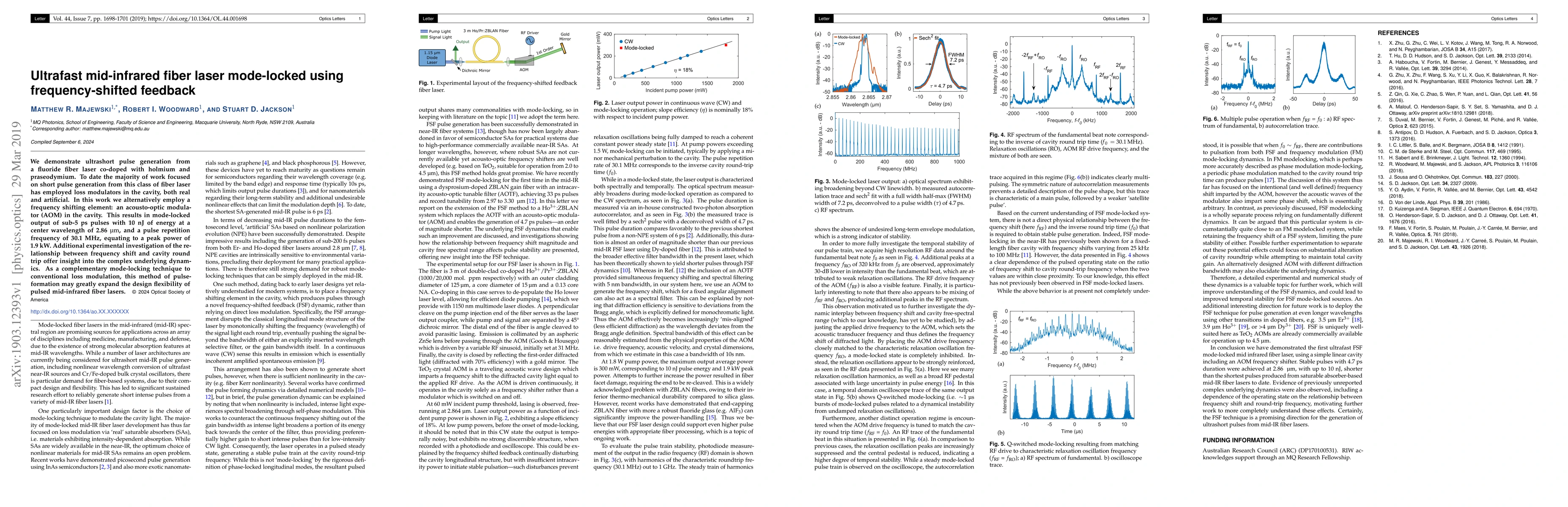 We demonstrate ultrashort pulse generation from a fluoride fiber laser co-doped with holmium and praseodymium. To date the majority of work focused on short pulse generation from this class of fiber laser has employed loss modulators in the cavity, both real and artificial. In this work we alternatively employ a frequency shifting element: an acousto-optic modulator (AOM) in the cavity. This results in mode-locked output of sub-5 ps pulses with 10 nJ of energy at a center wavelength of 2.86 {\mu}m, and a pulse repetition frequency of 30.1 MHz, equating to a peak power of 1.9 kW. Additional experimental investigation of the relationship between frequency shift and cavity round trip offer insight into the complex underlying dynamics. As a complementary mode-locking technique to conventional loss modulation, this method of pulse formation may greatly expand the design flexibility of pulsed mid-infrared fiber lasers.