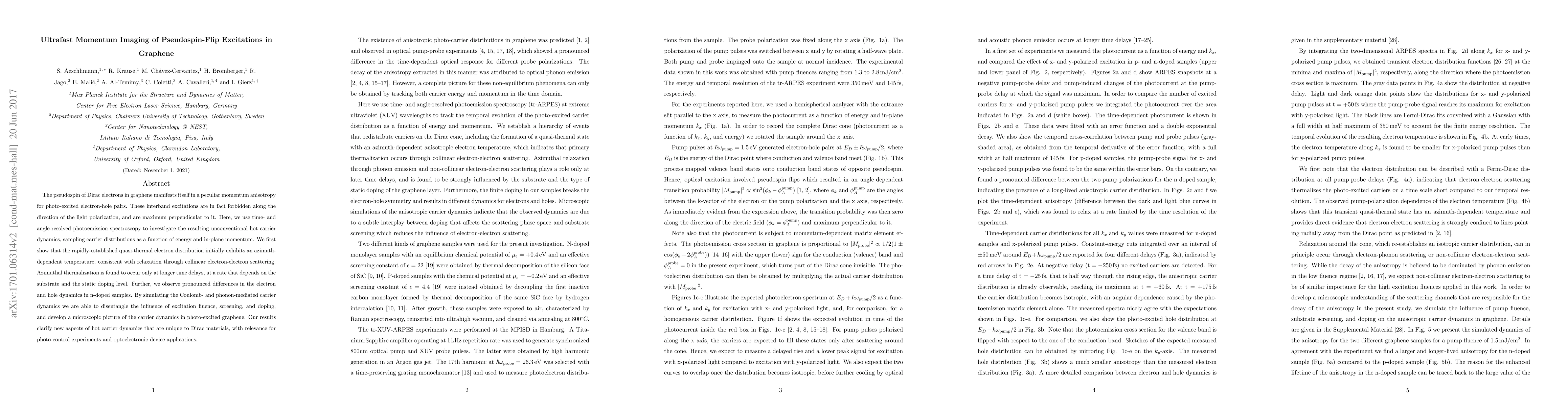 This paper investigates ultrafast momentum imaging of pseudospin-flip excitations in graphene using time-resolved photoemission spectroscopy, revealing anisotropic hot carrier dynamics and substrate-dependent azimuthal thermalization. The study provides insights into the unique carrier dynamics in Dirac materials, relevant for optoelectronic applications.