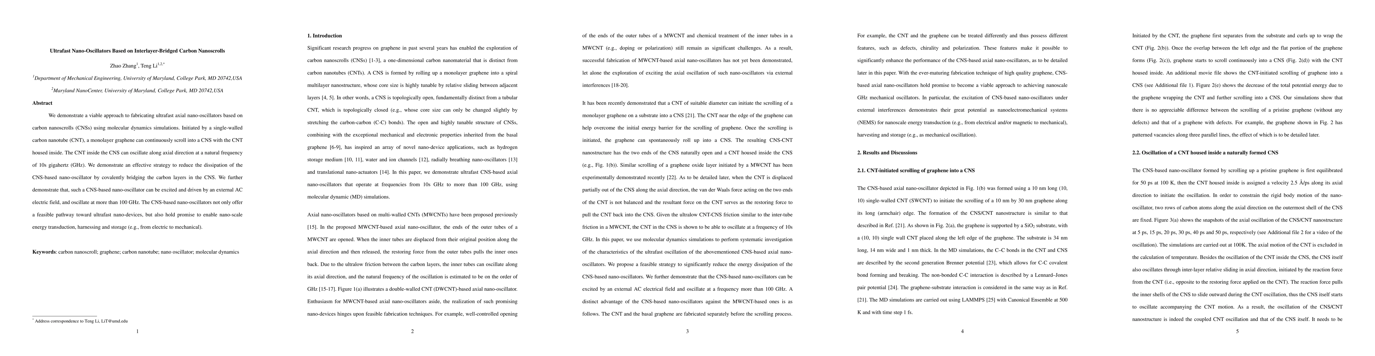 This paper details the fabrication of ultrafast axial nano-oscillators based on interlayer-bridged carbon nanoscrolls, showing natural oscillation frequencies in the 10s GHz range and enhanced performance via covalent bridging. These CNS-based nano-oscillators can be driven by external AC fields to exceed 100 GHz, promising applications in ultrafast nano-devices and energy transduction.