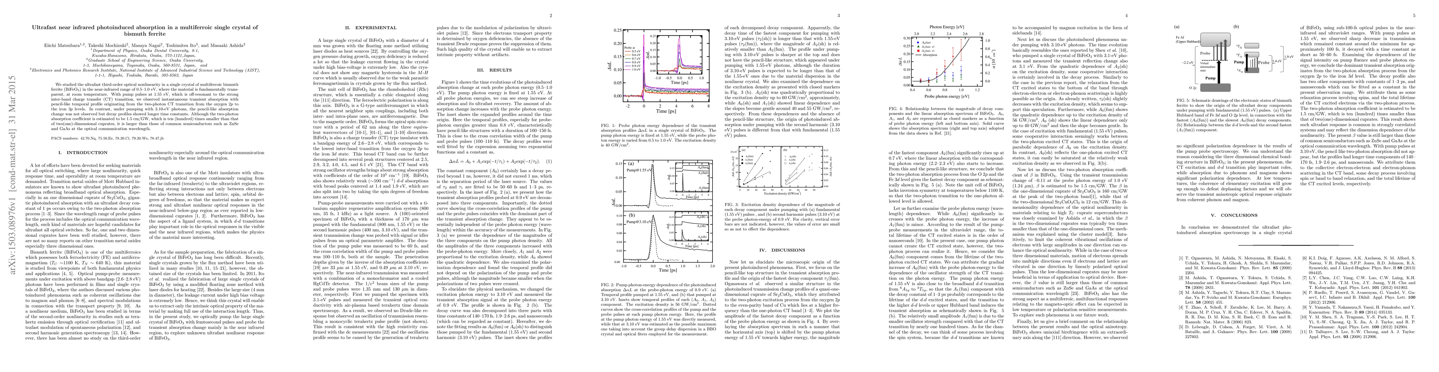 Researchers observed ultrafast near-infrared photoinduced absorption in a multiferroic material, bismuth ferrite, with two-photon transitions originating from oxygen to iron levels. The absorption coefficient was found to be 1.5 cm/GW, larger than common semiconductors at the optical communication wavelength.