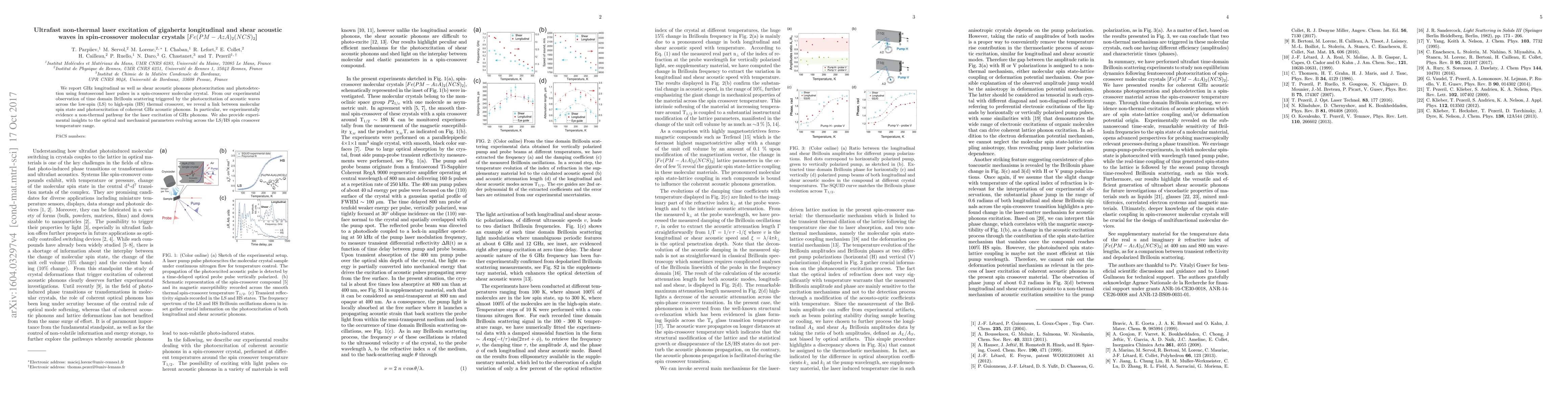 This paper reports the ultrafast non-thermal excitation of GHz longitudinal and shear acoustic phonons in spin-crossover molecular crystals using femtosecond laser pulses, revealing a connection between molecular spin states and coherent phonon excitation. The study provides insights into the optical and mechanical parameters' evolution across the spin crossover temperature.