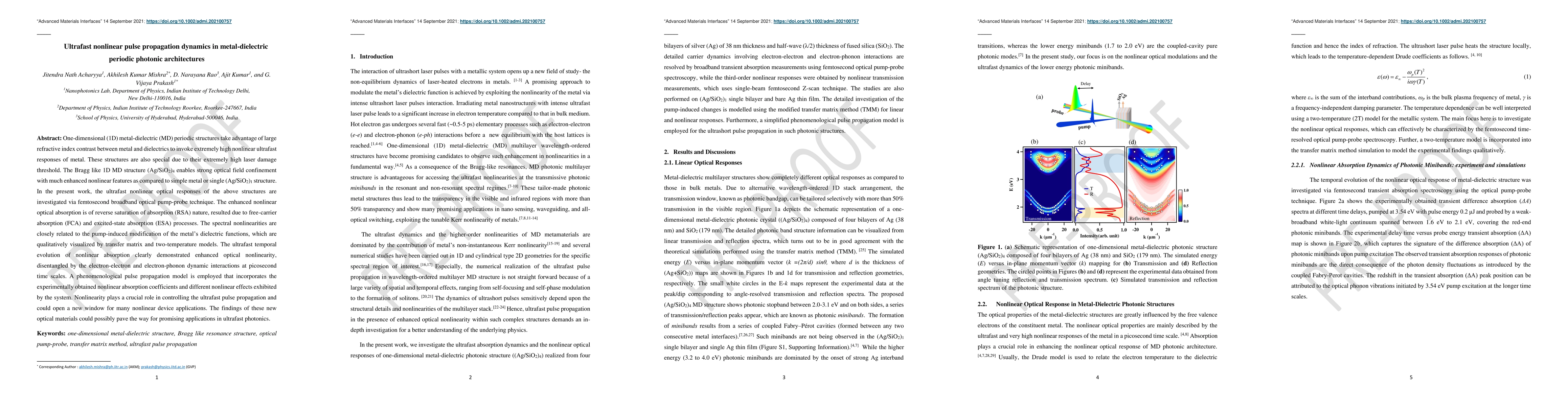 This research investigates ultrafast nonlinear pulse propagation in 1D metal-dielectric periodic structures, specifically Ag/SiO2, employing femtosecond pump-probe techniques. Enhanced nonlinear absorption due to free-carrier and excited-state absorption processes is observed, revealing crucial insights into the temporal dynamics and potential applications in ultrafast photonic devices.