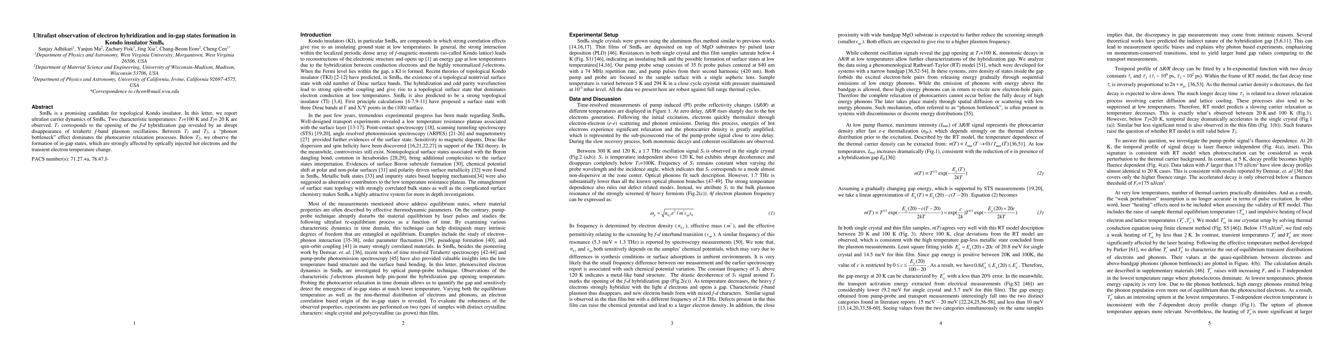 This paper reports ultrafast dynamics in SmB6, revealing two critical temperatures: T1=100 K marks the opening of the f-d hybridization gap, while T2=20 K indicates the formation of in-gap states influenced by hot electrons and temperature changes.