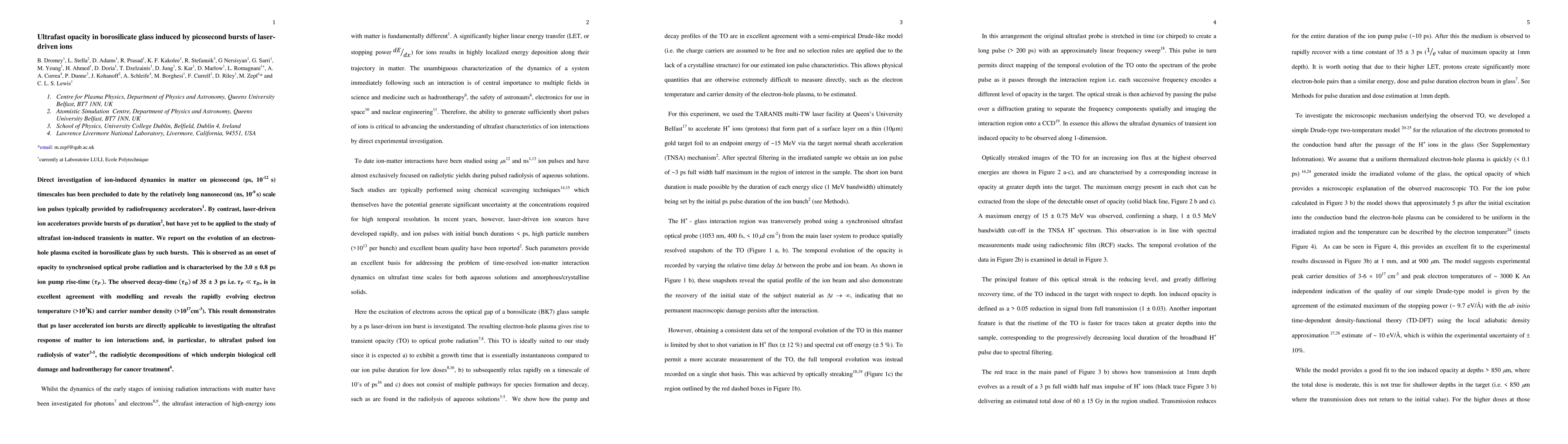 This paper investigates the ultrafast opacity in borosilicate glass induced by picosecond bursts of laser-driven ions, revealing a rise-time of 3.0 ± 0.8 ps and a decay-time of 35 ± 3 ps. The findings demonstrate the potential of laser-driven ion accelerators for studying the rapid response of matter to ion interactions.
