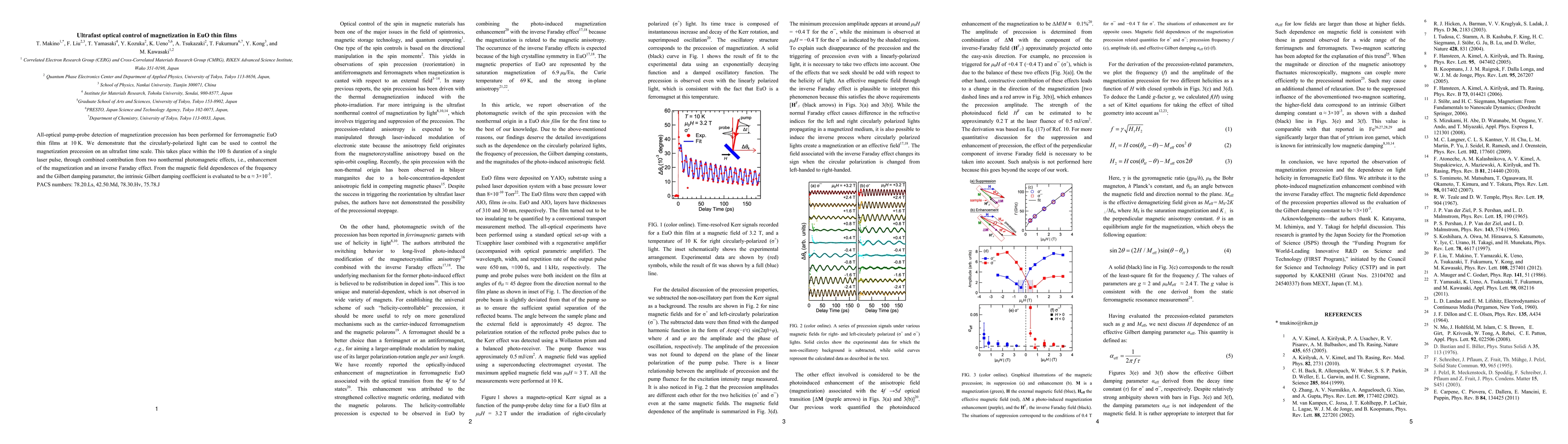 This paper investigates ultrafast optical manipulation of magnetization in EuO thin films using circularly-polarized light, achieving control within 100 fs via nonthermal photomagnetic effects, with intrinsic Gilbert damping coefficient evaluated at {\alpha} \approx 3\times10^-3.